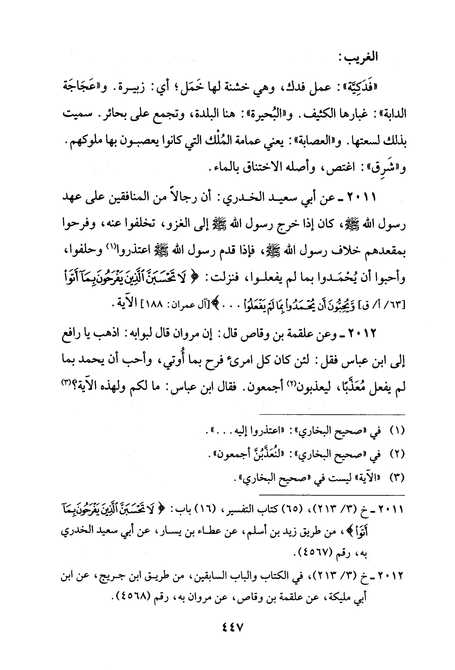2011 - عن أبي سعيد الخدري: أن رجالًا من المنافقين على عهد رسول اللَّه -صلى اللَّه عليه وسلم-، كان إذا خرج رسول اللَّه -صلى اللَّه عليه وسلم- إلى الغزو، تخلفوا عنه، وفرحوا بمقعدهم خلاف رسول اللَّه -صلى اللَّه عليه وسلم-، فإذا قدم رسول اللَّه -صلى اللَّه عليه وسلم- اعتذروا (¬1) وحلفوا، وأحبوا أن يُحْمَدوا بما لم يفعلوا، فنزلت: {لَا تَحْسَبَنَّ الَّذِينَ يَفْرَحُونَ بِمَا أَتَوْا وَيُحِبُّونَ أَنْ يُحْمَدُوا بِمَا لَمْ يَفْعَلُوا. . .} [آل عمران: 188] الآية.