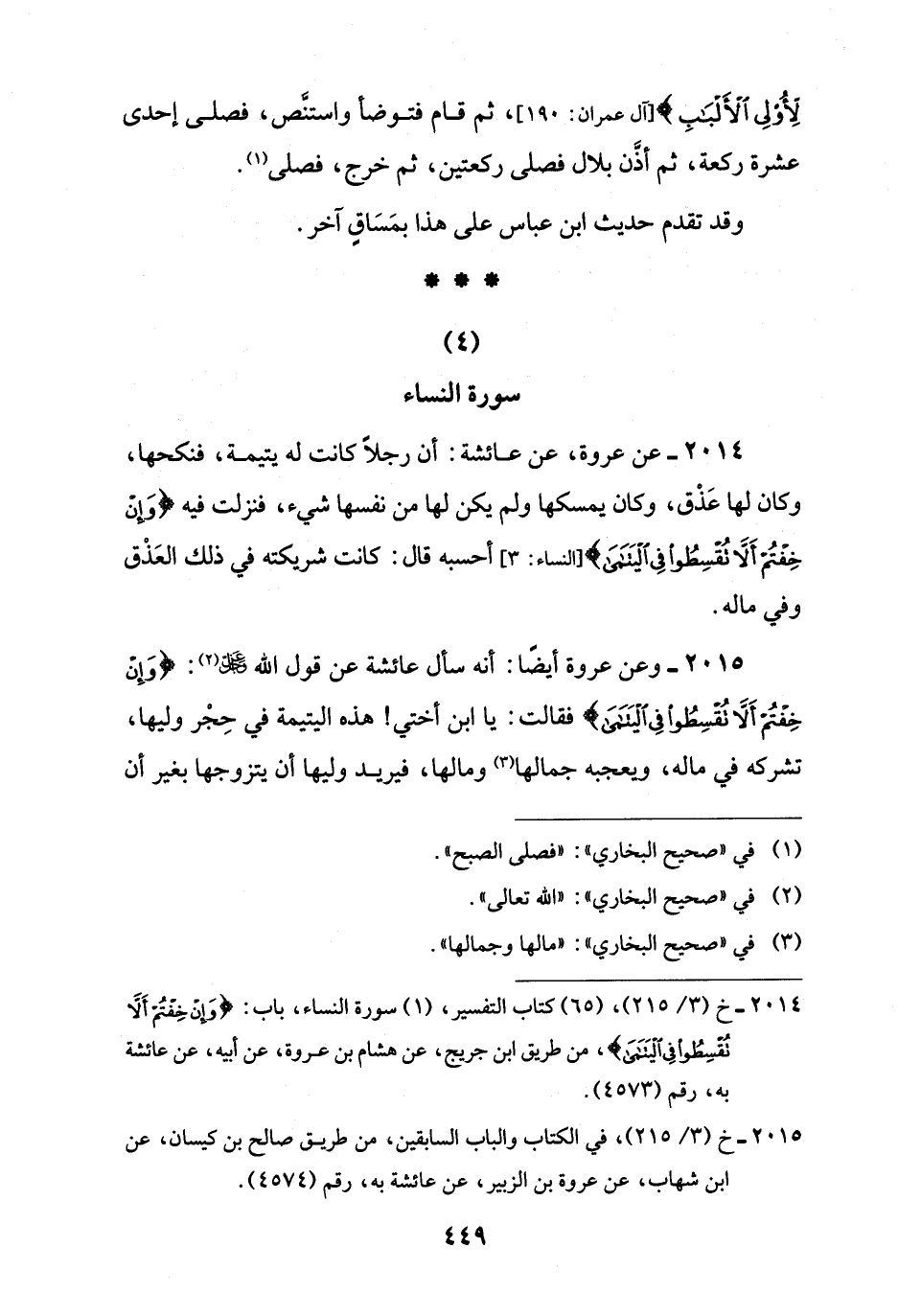 2014 - عن عروة، عن عائشة: أن رجلًا كانت له يتيمة، فنكحها، وكان لها عَذْق، وكان يمسكها ولم يكن لها من نفسها شيء، فنزلت فيه {وَإِنْ خِفْتُمْ أَلَّا تُقْسِطُوا فِي الْيَتَامَى} [النساء: 3] أحسبه قال: كانت شريكته في ذلك العَذْق وفي ماله.