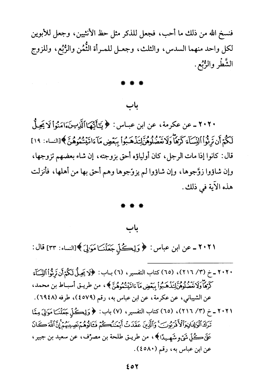 2020 - عن عكرمة، عن ابن عباس: {يَاأَيُّهَا الَّذِينَ آمَنُوا لَا يَحِلُّ لَكُمْ أَنْ تَرِثُوا النِّسَاءَ كَرْهًا وَلَا تَعْضُلُوهُنَّ لِتَذْهَبُوا بِبَعْضِ مَا آتَيْتُمُوهُنَّ} [النساء: 19]، قال: كانوا إذا مات الرجل، كان أولياؤه أحق بزوجته، إن شاء بعضهم تزوجها، وإن شاؤوا زوَّجوها، وإن شاؤوا لم يزوّجوها وهم أحق بها من أهلها، فأنزلت هذه الآية في ذلك.