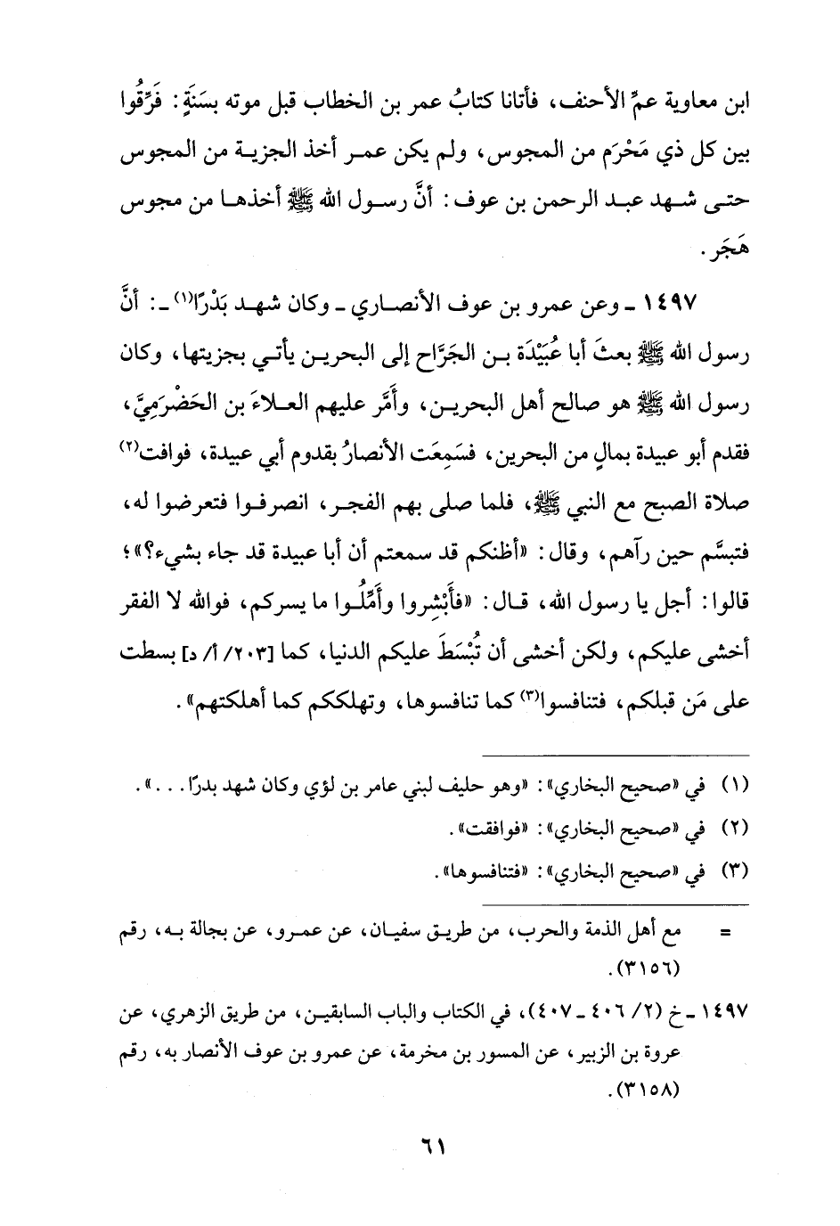 1497 - خ (2/ 406 - 407)، في الكتاب والباب السابقين، من طريق الزهري، عن عروة بن الزبير، عن المسور بن مخرمة، عن عمرو بن عوف الأنصار به، رقم (3158).