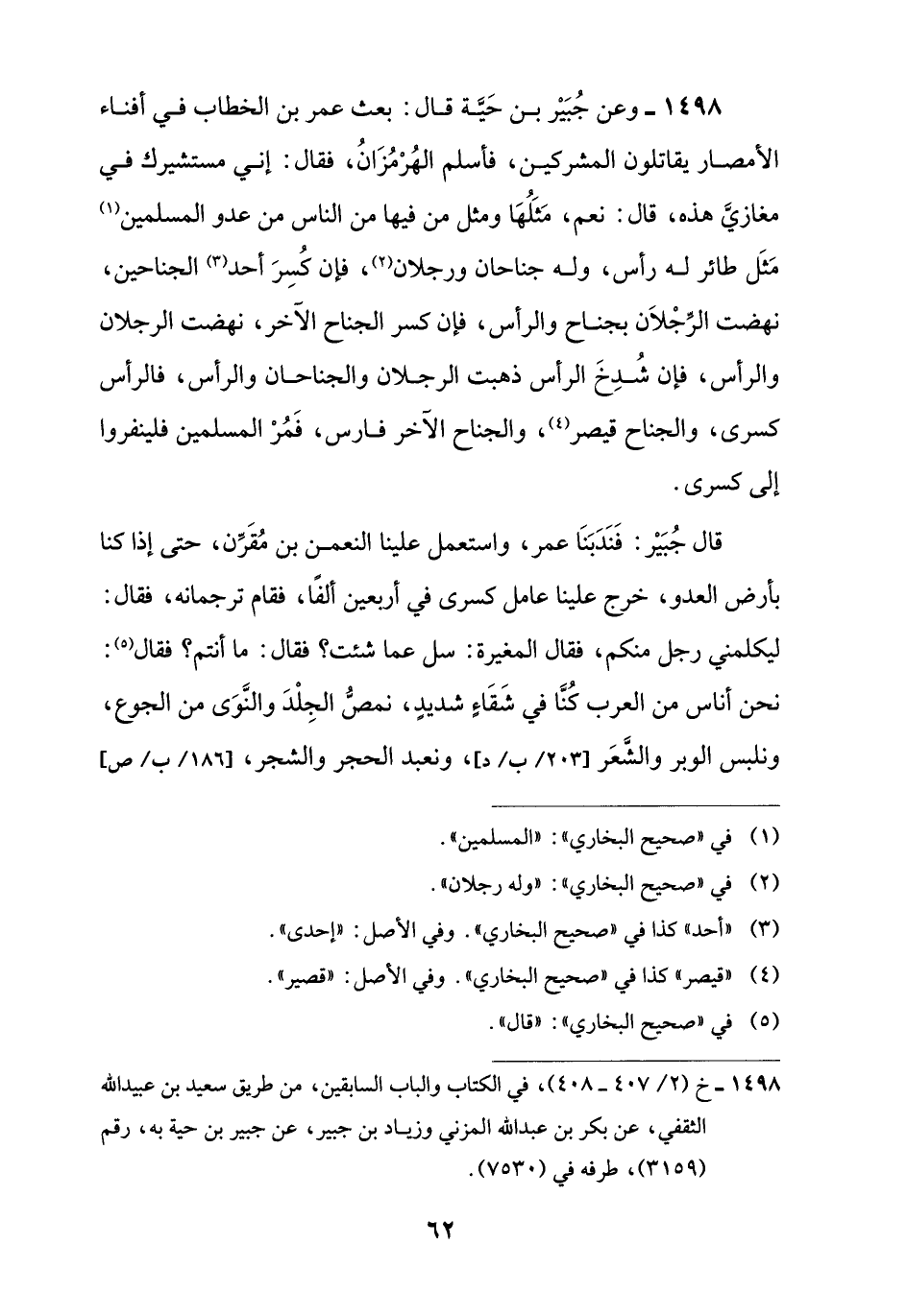 1498 - وعن جُبَيْر بن حَيَّة قال: بعث عمر بن الخطاب في أفناء الأمصار يقاتلون المشركين، فأسلم الهُرْمُزَانُ، فقال: إني مستشيرك في مغازيَّ هذه، قال: نعم، مَثَلُهَا ومثل من فيها من الناس من عدو المسلمين (¬1) مَثَل طائر له رأس، وله جناحان ورجلان (¬2)، فإن كُسِرَ أحد (¬3) الجناحين، نهضت الرِّجْلَان بجناح والرأس، فإن كسر الجناح الآخر، نهضت الرجلان والرأس، فإن شُدِخَ الرأس ذهبت الرجلان والجناحان والرأس، فالرأس كسرى، والجناح قيصر (¬4)، والجناح الآخر فارس، فَمُرْ المسلمين فلينفروا إلى كسرى.