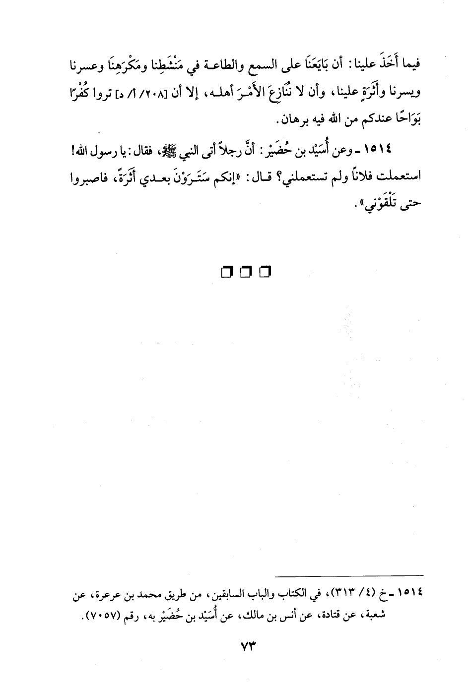 1514 - وعن أُسَيْد بن حُضَيْر: أنَّ رجلًا أتى النبي -صلى اللَّه عليه وسلم-، فقال: يا رسول اللَّه! استعملت فلانًا ولم تستعملني؟ قال: "إنكم سَتَرَوْنَ بعدي أثَرَةً، فاصبروا حتى تَلْقَوْني".