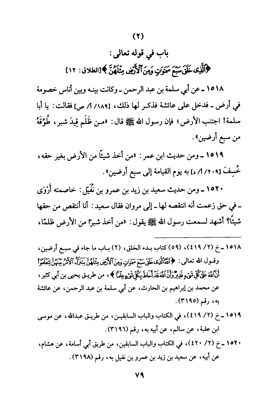 1518 - خ (2/ 419)، (59) كتاب بدء الخلق، (2) باب ما جاء في سبع أرضين، وقول اللَّه تعالى: {اللَّهُ الَّذِي خَلَقَ سَبْعَ سَمَاوَاتٍ وَمِنَ الْأَرْضِ مِثْلَهُنَّ يَتَنَزَّلُ الْأَمْرُ بَيْنَهُنَّ لِتَعْلَمُوا أَنَّ اللَّهَ عَلَى كُلِّ شَيْءٍ قَدِيرٌ وَأَنَّ اللَّهَ قَدْ أَحَاطَ بِكُلِّ شَيْءٍ عِلْمًا}، من طريق يحيى بن أبي كثير، عن محمد بن إبراهيم بن الحارث، عن أبي سلمة بن عبد الرحمن، عن عائشة به، رقم (3195).