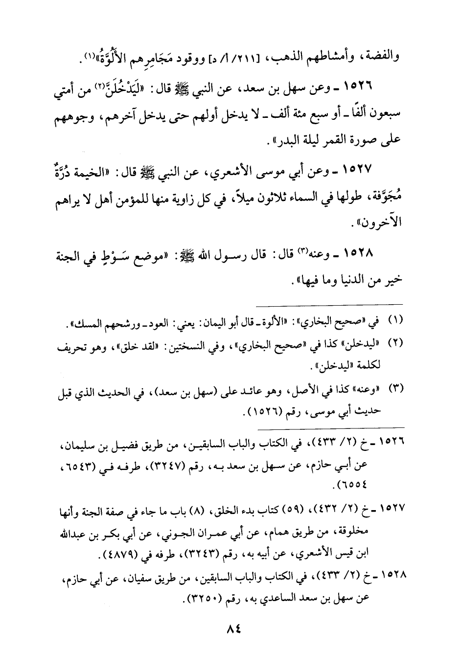1527 - خ (2/ 432)، (59) كتاب بدء الخلق، (8) باب ما جاء في صفة الجنة وأنها مخلوقة، من طريق همام، عن أبي عمران الجوني، عن أبي بكر بن عبد اللَّه ابن قيس الأشعري، عن أبيه به، رقم (3243)، طرفه في (4879).