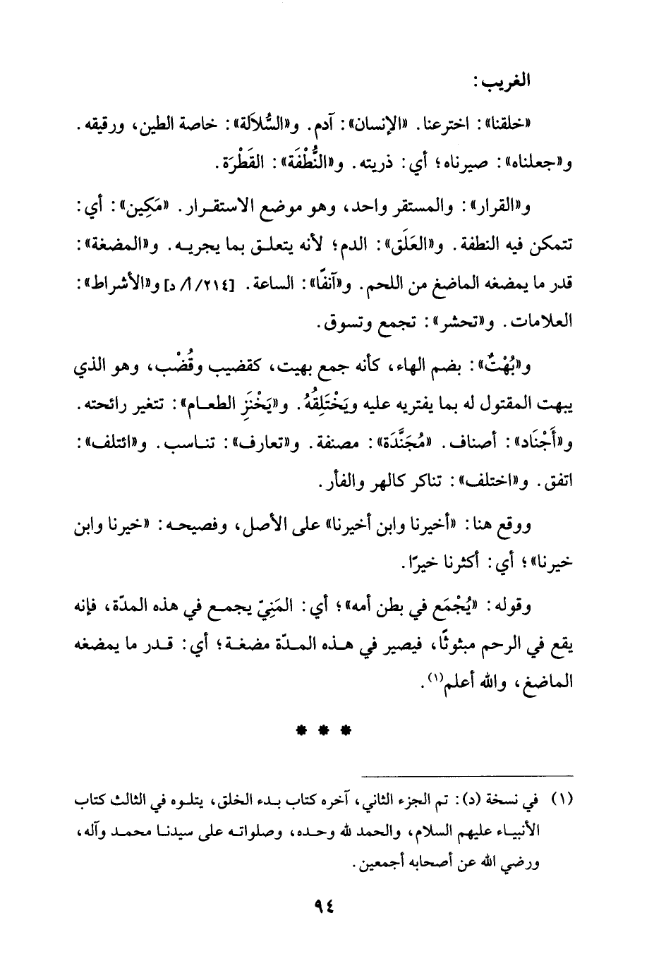 و"القرار": والمستقر واحد، وهو موضع الاستقرار. "مَكِين": أي: تتمكن فيه النطفة. و"العَلَق": الدم؛ لأنه يتعلق بما يجريه. و"المضغة": قدر ما يمضغه الماضغ من اللحم. و"آنفًا": الساعة. و"الأشراط": العلامات. و"تحشر": تجمع وتسوق.