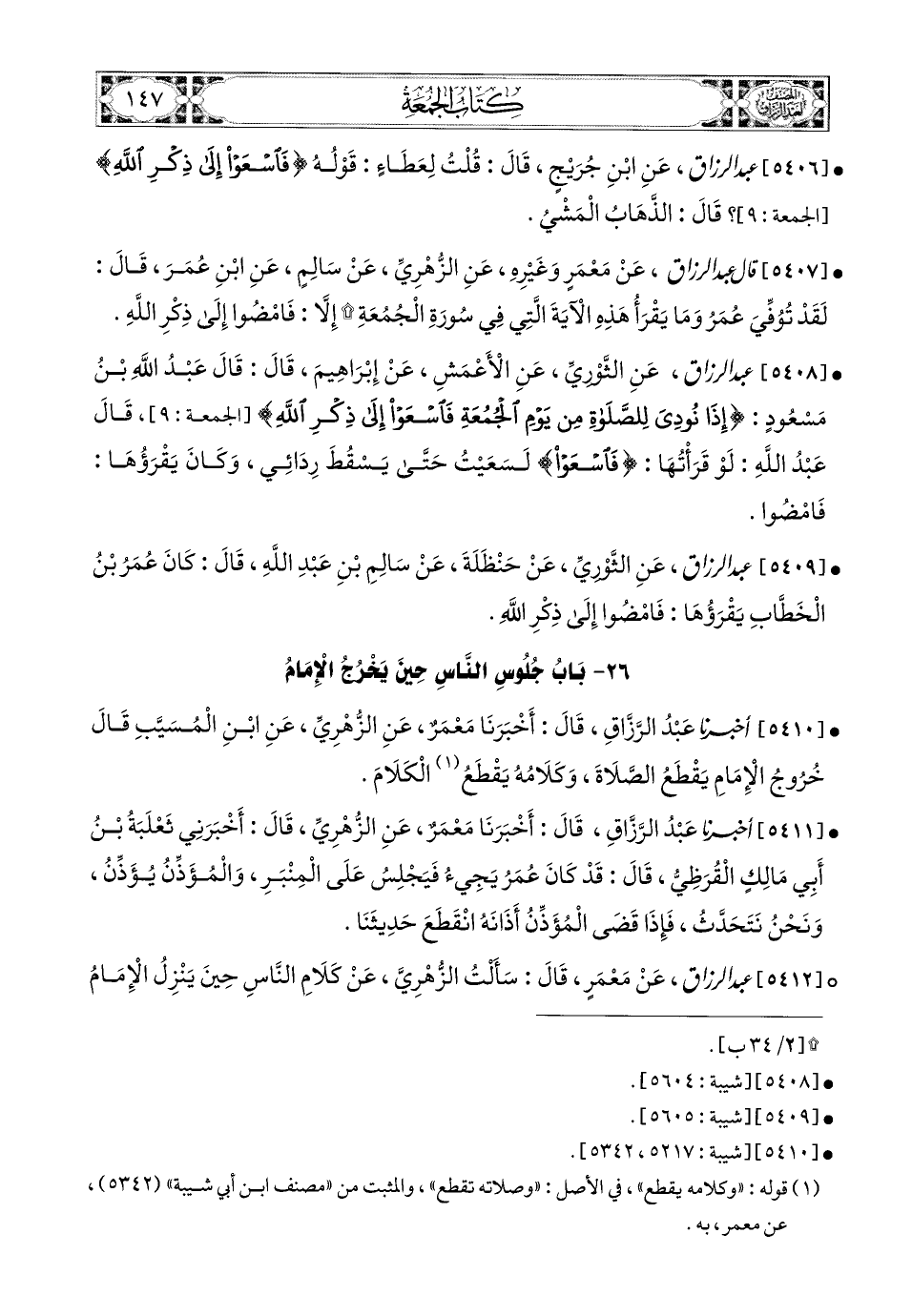 5407- قَالَ عَبْدُ الرَّزَّاقِ، عَنْ مَعْمَرٍ، وَغَيْرِهِ، عَنِ الزُّهْرِيِّ، عَن سَالِمٍ، عَنِ ابْنِ عُمَرَ، قَالَ: لَقَدْ تُوُفِّيَ عُمَرُ، وَمَا يَقْرَأُ هَذِهِ الآيَةَ الَّتِي فِي سُورَةِ الْجُمُعَةِ إِلاَّ: فَامْضُوا إِلَى ذِكْرِ اللهِ.