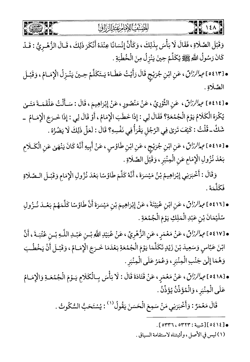 5417- عبد الرزاق، عَنْ مَعْمَرٍ، عَنِ الزُّهْرِيِّ، عَن عُبَيْدِ اللهِ بْنِ عَبدِ اللهِ بْنِ عُتْبَةَ، أَنَّ ابْنَ عَبَّاسٍ، وَسَعيدَ بن زَيْدٍ تَكَلَّمَا يَوْمَ الْجُمُعَةِ بَعْدَ مَا خَرَجَ الإِمَامُ وَقَبْلَ أَنْ يَخْطُبَ وَهُمَا إِلَى جَنْبِ المِنْبَرِ، وَعُمَرُ عَلَى المِنْبَرِ.