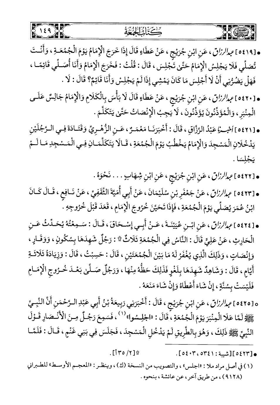 5425- عبد الرزاق، عَنِ ابْنِ جُرَيْجٍ، قَالَ: أَخْبَرَنِي رَبِيعَةُ بن أَبِي عَبدِ الرَّحْمَنِ، أَنَّ النَّبِيَّ صَلَّى اللهُ عَلَيْهِ وَسَلَّمَ لَمَّا عَلاَ المِنْبَرَ يَوْمَ الْجُمُعَةِ، قَالَ: اجْلِسُوا، فَسَمِعَ رَجُلٌ مِنَ الأَنْصَارِ قَوْلَ النَّبِيِّ صَلَّى اللهُ عَلَيْهِ وَسَلَّمَ ذَلِكَ، وَهُوَ بِالطَّرِيقِ لَمْ يَدْخُلِ المَسْجِدَ، فَجَلَسَ فِي بَنِي غَنْمٍ، قَالَ: فَلَمَّا أُقِيمَتِ الصَّلاَةُ دَخَلَ الرَّجُلُ، فَقَالَ لَهُ النَّبِيُّ صَلَّى اللهُ عَلَيْهِ وَسَلَّمَ: أَلاَ رُحْتَ؟ فَأَخْبَرَهُ الْخَبَرَ، فَقَالَ النَّبِيُّ صَلَّى اللهُ عَلَيْهِ وَسَلَّمَ: خَيْرًا، زَعَمُوا أَنَّ ذَلِكَ الرَّجُلَ عَبدُ اللهِ بن رَوَاحَةَ.