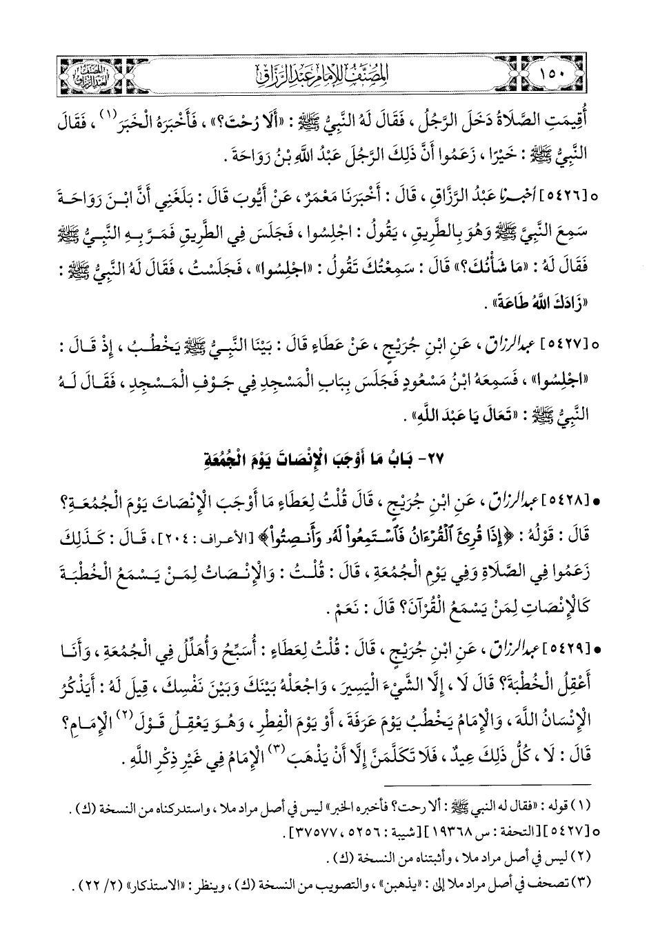 5427- عبد الرزاق، عَنِ ابْنِ جُرَيْجٍ، عَنْ عَطَاءٍ، قَالَ: بَيْنَا النَّبِيُّ صَلَّى اللهُ عَلَيْهِ وَسَلَّمَ يَخْطُبُ إِذْ قَالَ: اجْلِسُوا، فَسَمِعَهُ ابْنُ مَسْعُودٍ، فَجَلَسَ بِبَابِ المَسْجِدِ فِي جَوْفِ المَسْجِدِ، فَقَالَ لَهُ النَّبِيُّ صَلَّى اللهُ عَلَيْهِ وَسَلَّمَ: تَعَالَ يَا عَبدَ اللهِ.