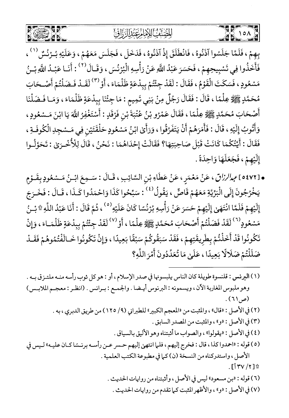 5472- عبد الرزاق، عَنْ مَعْمَرٍ، عَنْ عَطَاءِ بْنِ السَّائِبِ قَالَ: سَمِعَ ابْنَ مَسْعُودٍ بِقَوْمٍ يَخْرُجُونَ إِلَى الْبَرِّيَّةِ مَعَهُمْ قَاصٌّ يَقُولُ: سَبِّحُوا كَذَا، وَاحْمَدُوا كَذَا، قَالَ: فَخَرَجَ إِلَيْهِمْ، فَلَمَّا انْتَهَى إِلَيْهِمْ حَسَرَ عَنْ رَأْسِهِ بُرْنُسًا كَانَ عَلَيْهِ، ثُمَّ قَالَ: أَنَا عَبدُ اللهِ بْنُ مَسْعُودٍ، لَقَدْ فَضَلْتُمْ أَصْحَابَ مُحَمَّدٍ صَلَّى اللهُ عَلَيْهِ وَسَلَّمَ عِلْمًا، أَوْ لَقَدْ جِئْتُمْ بِبِدْعَةٍ ظَلْمَاءَ، وَإِنْ تَكُونُوا قَدْ أَخَذْتُمْ بِطَرِيقَتِهِمْ، فَقَدْ سَبَقُوكم سَبْقًا بَعِيدًا، وَإِنْ تَكُونُوا خَالَفْتُمُوهُمْ فَقَدْ ضَلَلْتُمْ ضَلاَلاً بَعِيدًا، عَلَى مَا تُعَدِّدُونَ أَمْرَ اللهِ؟.