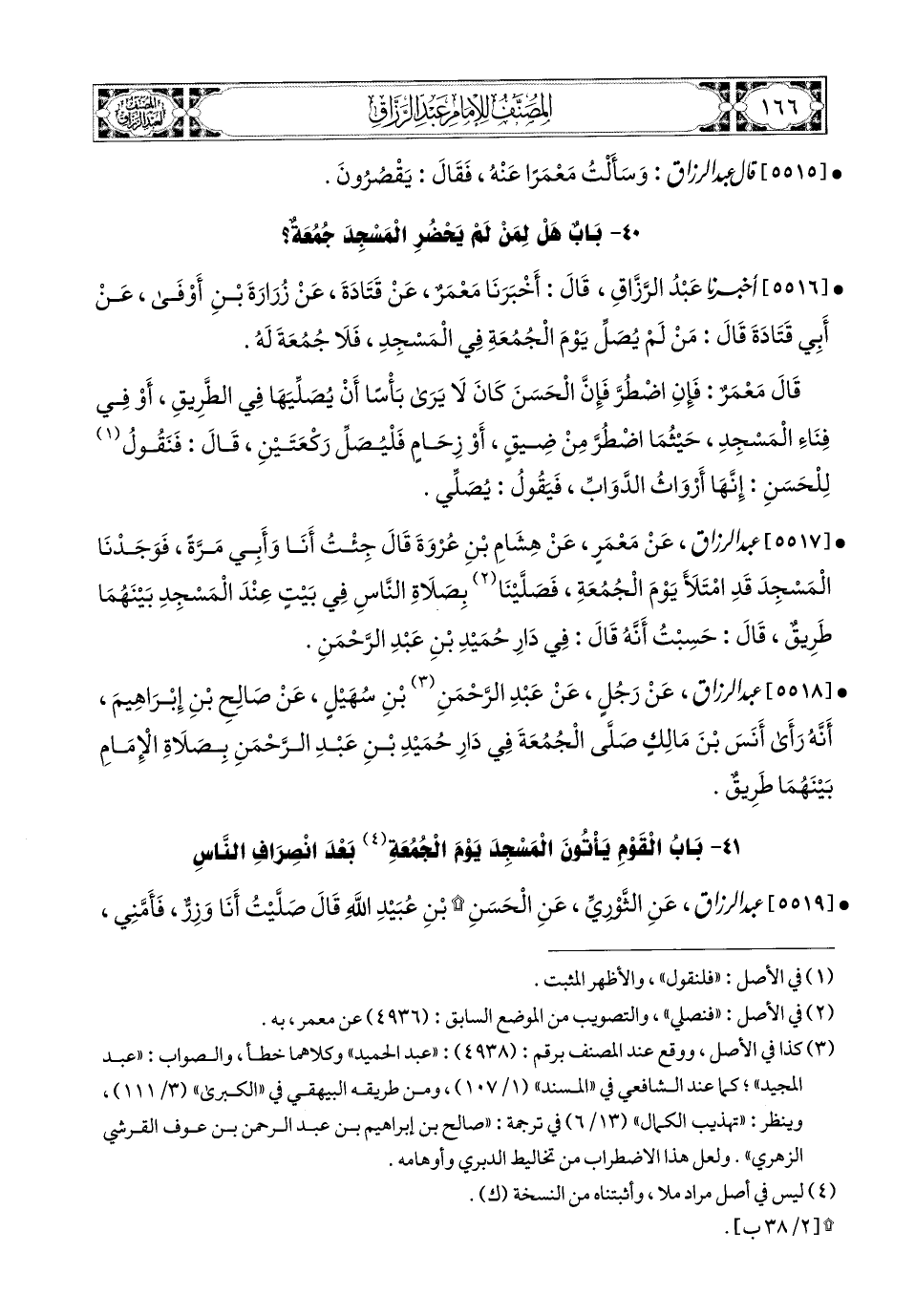 5517- عبد الرزاق، عَنْ مَعْمَرٍ، عَن هِشَامِ بْنِ عُرْوَةَ قَالَ: جِئْتُ أنا وَأَبِي مَرَّةً، فَوَجَدْنَا المَسْجِدَ قَدِ امْتَلأَ يَوْمَ الْجُمُعَةِ، فَصَلَّيْنَا بِصَلاَةِ النَّاسِ فِي بَيْتٍ عِنْدَ المَسْجِدِ بَيْنَهُمَا طَرِيقٌ، قَالَ: حَسِبْتُ أَنَّهُ قَالَ: فِي دَارِ حُمَيْدِ بْنِ عَبدِ الرَّحْمَنِ.