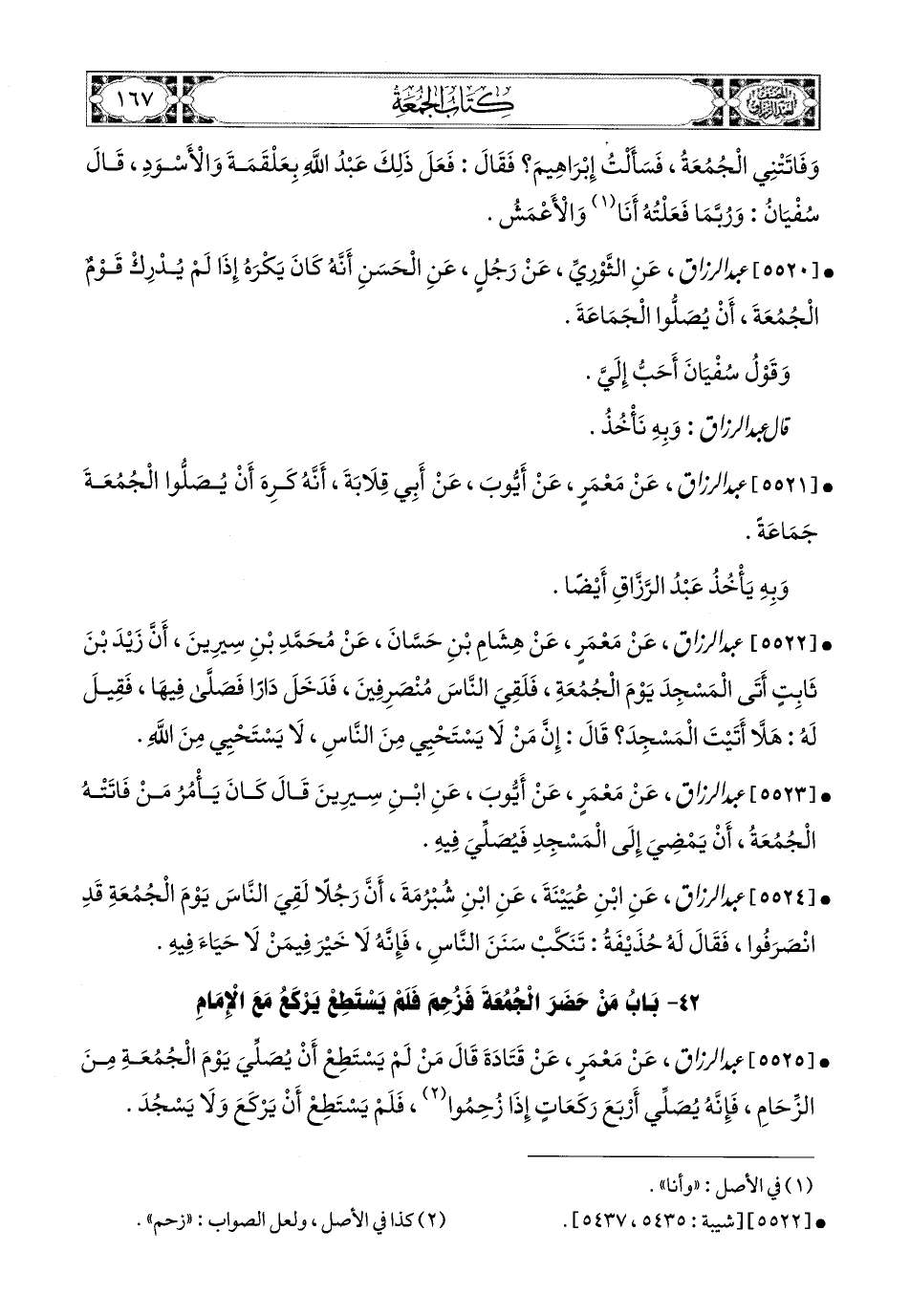 5522- عبد الرزاق، عَنْ مَعْمَرٍ، عَن هِشَامِ بْنِ حَسَّانَ، عَن مُحَمَّدِ بْنِ سِيرِينَ، أَنَّ زَيْدَ بن ثَابِتٍ أَتَى المَسْجِدَ يَوْمَ الْجُمُعَةِ، فَلَقِي النَّاسَ مُنْصَرِفِينَ، فَدَخَلَ دَارًا فَصَلَّى فِيهَا، فَقِيلَ لَهُ: هَلاَّ أَتَيْتَ المَسْجِدَ؟ قَالَ: إِنَّ مَنْ لاَ يَسْتَحْيِي مِنَ النَّاسِ لاَ يَسْتَحْيِي مِنَ اللهِ.