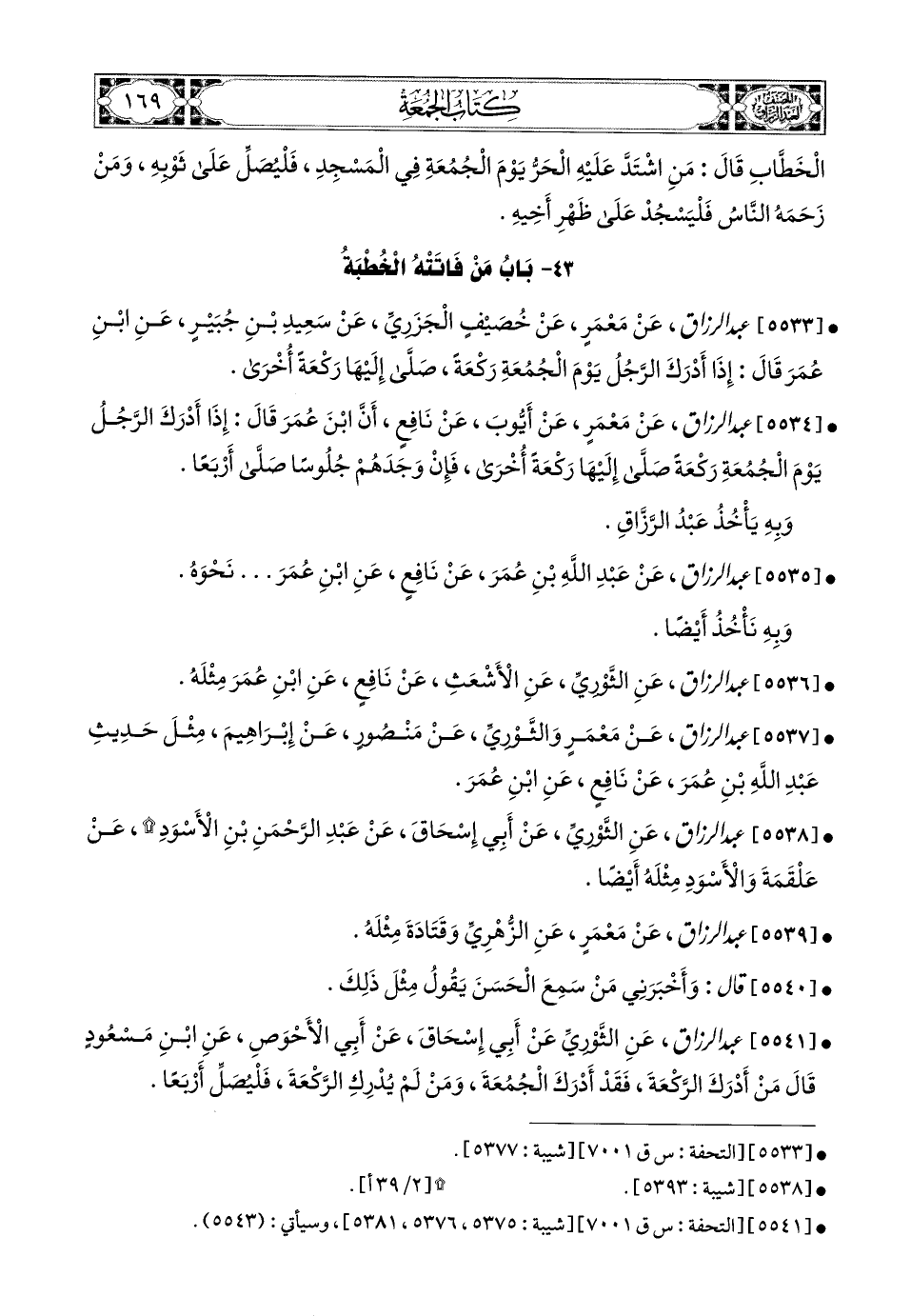 5534- عبد الرزاق، عَنْ مَعْمَرٍ، عَنْ أَيُّوبَ، عَن نَافِعٍ، أَنَّ ابْنَ عُمَرَ، قَالَ: إِذَا أَدْرَكَ الرَّجُلُ يَوْمَ الْجُمُعَةِ رَكْعَةً صَلَّى إِلَيْهَا رَكْعَةً أُخْرَى، فَإِنْ وَجَدَهُمْ جُلُوسًا صَلَّى أَرْبَعًا.