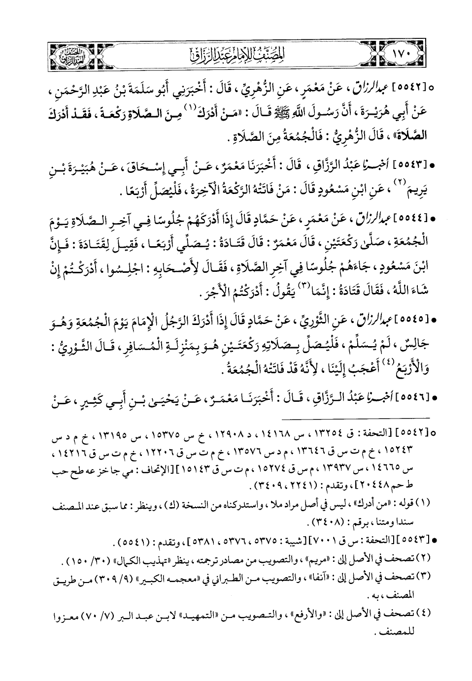 5542- عبد الرزاق، عَنْ مَعْمَرٍ، عَنِ الزُّهْرِيِّ، قَالَ: أَخْبَرَنِي أَبو سَلَمَةَ بن عَبدِ الرَّحْمَنِ، عَنْ أَبِي هُرَيرَةَ، أَنَّ رَسُولَ اللهِ صَلَّى اللهُ عَلَيْهِ وَسَلَّمَ قَالَ: مَنْ أَدْرَكَ مِنَ الصَّلاَةِ رَكْعَةً فَقَدْ أَدْرَكَ الصَّلاَةَ.