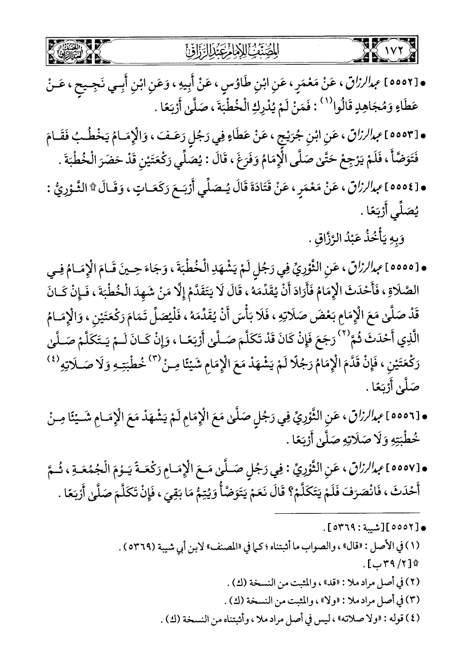 5555- عبد الرزاق، عَنِ الثَّورِيِّ؛ فِي رَجُلٍ لَمْ يَشْهَدِ الْخُطْبَةَ وَجَاءَ حِينَ قَامَ الإِمَامُ فِي الصَّلاَةِ، فَأَحْدَثَ الإِمَامُ، فَأَرَادَ أَنْ يُقَدِّمَهُ قَالَ: لاَ يَتَقَدَّمْ إِلاَّ مَنْ شَهِدَ الْخُطْبَةَ، فَإِنْ كَانَ قَدْ صَلَّى مَعَ الإِمَامِ بَعْضَ صَلاَتِهِ فَلاَ بَأْسَ أَنْ يُقَدِّمَهُ فَلْيُصَلِّ تَمَامَ رَكْعَتَيْنِ، وَالإِمَامُ الَّذِي أَحْدَثَ، ثُمَّ رَجَعَ فَإِنْ كَانَ قَدْ تَكَلَّمَ صَلَّى أَرْبَعًا، وَإِنْ كَانَ لَمْ يَتَكَلَّمْ صَلَّى رَكْعَتَيْنِ، فَإِنْ قَدَّمَ الإِمَامُ رَجُلاً لَمْ يَشْهَدْ مَعَ الإِمَامِ شَيْئًا مِنْ خُطْبَتِهِ وَلاَ صَلاَتِهِ صَلَّى أَرْبَعًا.