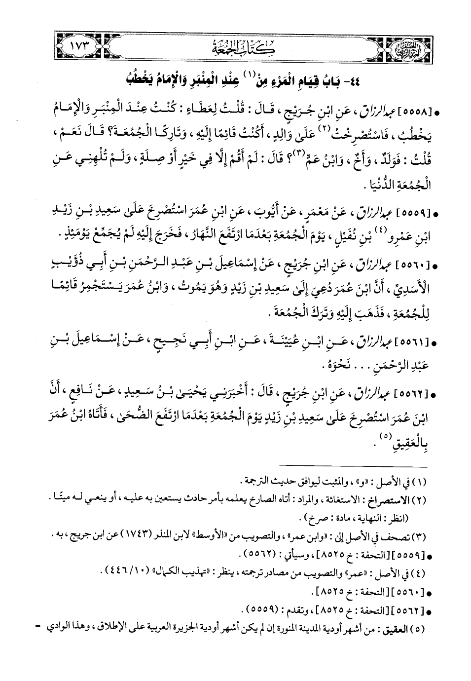 5560- عبد الرزاق، عَنِ ابْنِ جُرَيْجٍ، عَن إِسْمَاعِيلَ بْنِ عَبدِ الرَّحْمَنِ بْنِ أَبِي ذُؤَيْبٍ الأَسَدِيِّ، أَنَّ ابْنَ عُمَرَ دُعِيَ إِلَى سَعيدِ بْنِ زَيْدٍ وَهُوَ يَمُوتُ، وَابْنُ عُمَرَ يَسْتَجْمِرُ قَائِمًا لِلْجُمُعَةِ، فَذَهَبَ إِلَيْهِ وَتَرَكَ الْجُمُعَةَ.