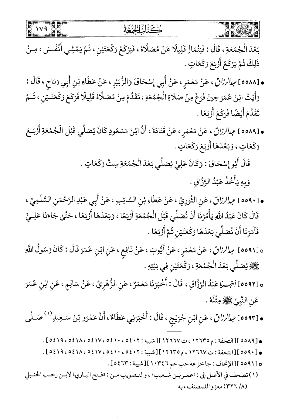 5589- عبد الرزاق، عَنْ مَعْمَرٍ، عَن قَتَادَةَ، أَنَّ ابْنَ مَسْعُودٍ كَانَ يُصَلِّي قَبْلَ الْجُمُعَةِ أَرْبَعَ رَكَعَاتٍ، وَبَعْدَهَا أَرْبَعَ رَكَعَاتٍ، قَالَ أَبو إِسْحَاقَ: وَكَانَ عَلِيٌّ يُصَلِّي بَعْدَ الْجُمُعَةِ سِتَّ رَكَعَاتٍ.