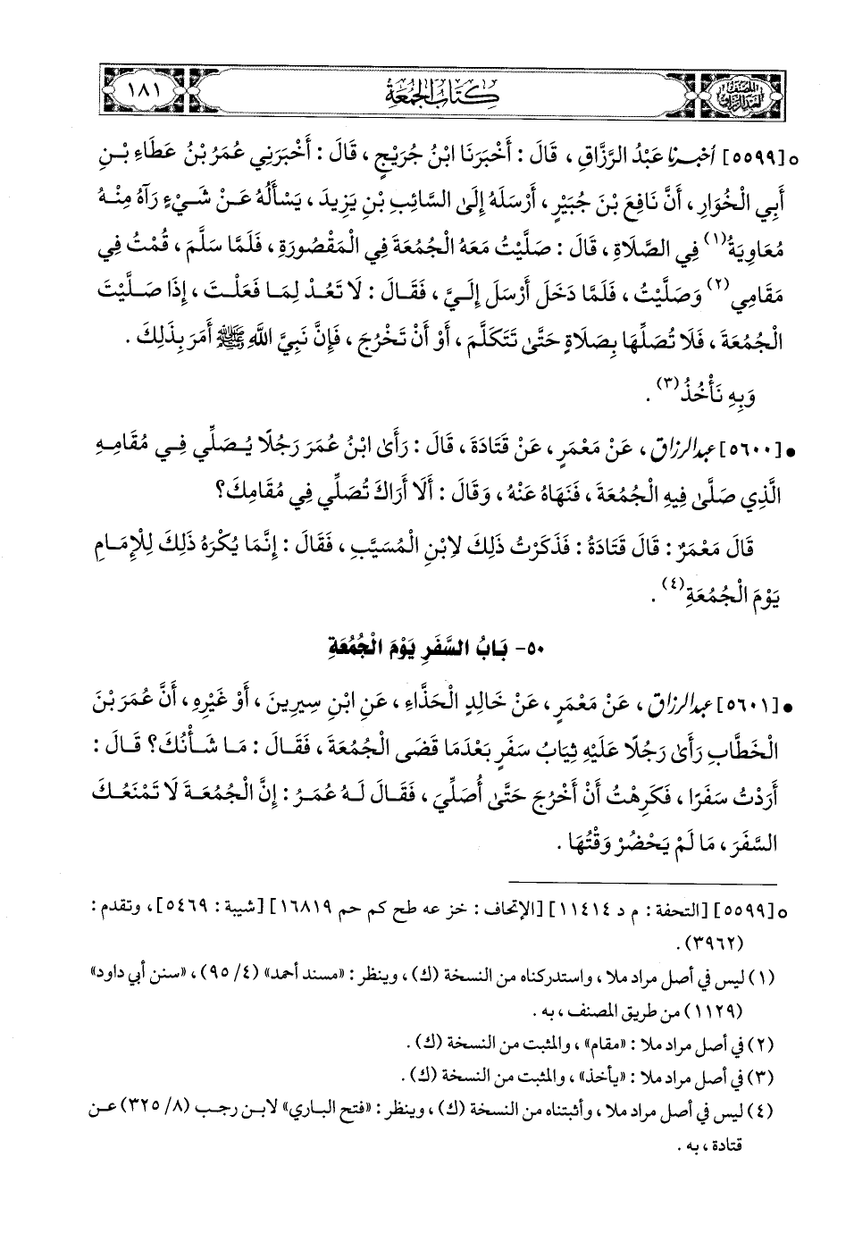 5601- عبد الرزاق، عَنْ مَعْمَرٍ، عَن خَالِدٍ الْحَذَّاءِ، عَنِ ابْنِ سِيرِينَ، أَوْ غَيْرِهِ، أَنَّ عُمَرَ بن الْخَطَّابِ رَأَى رَجُلاً عَلَيْهِ ثِيَابُ سَفَرٍ بَعْدَ مَا قَضَى الْجُمُعَةَ، فَقَالَ: مَا شَأْنُكَ؟ قَالَ: أَرَدْتُ سَفَرًا، فَكَرِهْتُ أَنْ أَخْرُجَ حَتَّى أُصَلِّيَ، فَقَالَ لَهُ عُمَرُ: إِنَّ الْجُمُعَةَ لاَ تَمْنَعُكَ السَّفَرَ مَا لَمْ يَحْضُرْ وَقْتُهَا.