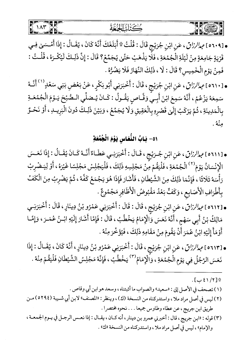5609- عبد الرزاق، عَنِ ابْنِ جُرَيْجٍ، قَالَ: قُلْتُ: أَبَلَغَكَ أَنَّهُ كَانَ يُقَالُ: إِذَا أَمْسَى فِي قَرْيَةٍ جَامِعَةٍ مِنْ لَيْلَةِ الْجُمُعَةِ، فَلاَ يَذْهَبْ حَتَّى يُجَمِّعَ؟ قَالَ: إِنَّ ذَلِكَ لَيُكْرَهُ، قُلْتُ: فَمِنْ يَوْمِ الْخَمِيسِ؟ قَالَ: لاَ، ذَلِكَ النَّهَارُ فَلاَ يَضُرُّهُ.