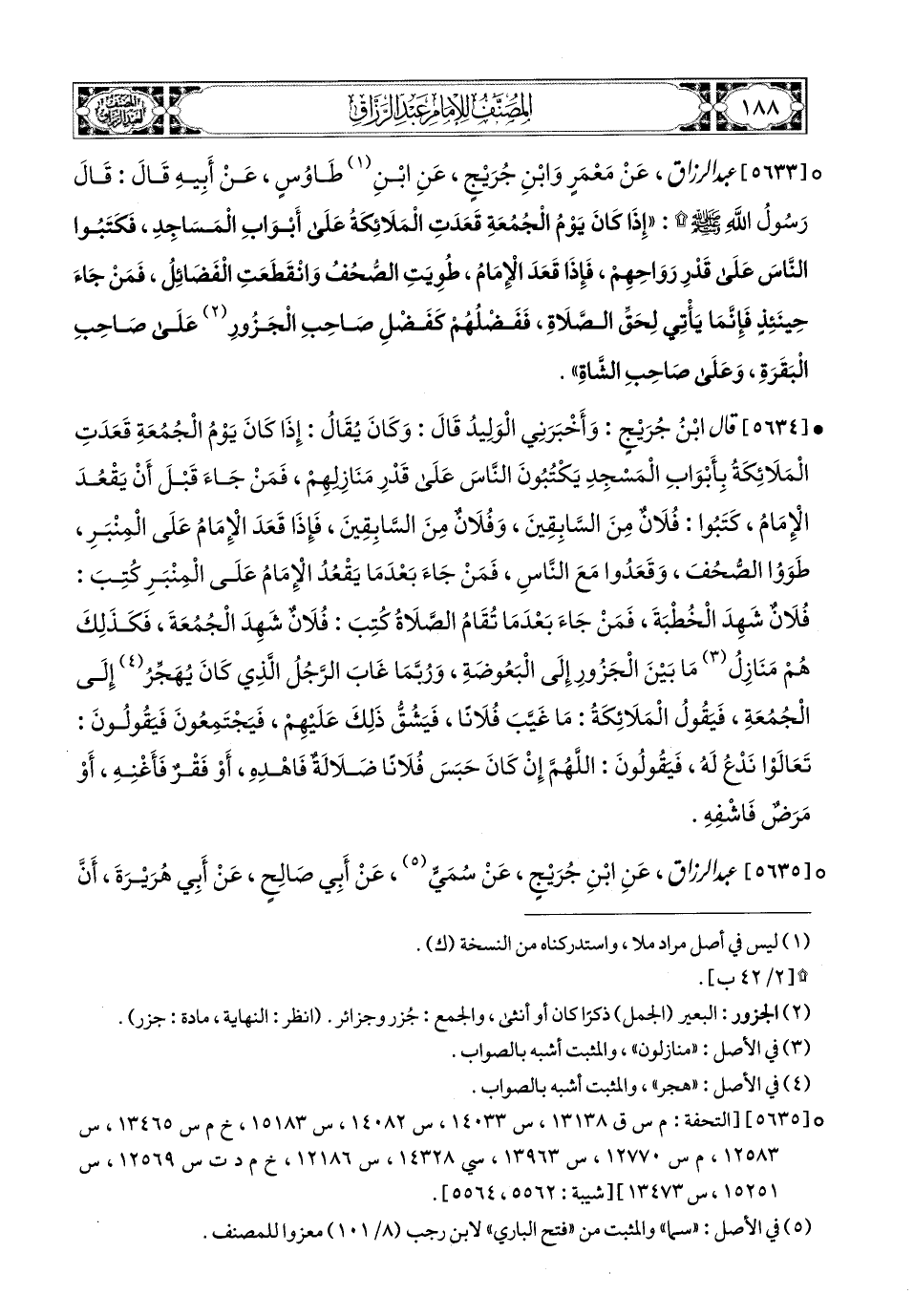 5633- عبد الرزاق، عَنْ مَعْمَرٍ، وَابْنِ جُرَيْجٍ، عَن طَاوُوسٍ، عَن أبيه قَالَ: قَالَ رَسُولُ اللهِ صَلَّى اللهُ عَلَيْهِ وَسَلَّمَ: إِذَا كَانَ يَوْمُ الْجُمُعَةِ قَعَدَتِ المَلاَئِكَةُ عَلَى أَبْوَابِ المَساجِدِ، فَكَتَبُوا النَّاسَ عَلَى قَدْرِ رَوَاحِهِمْ، فَإِذَا قَعَدَ الإِمَامُ، طُوِيَتِ الصُّحُفُ، وَانْقَطَعَتِ الْفَضَائِلُ، فَمَنْ جَاءَ حِينَئِذٍ، فَإِنَّمَا يَأْتِي لِحَقِّ الصَّلاَةِ، فَفَضْلُهُمْ كَفَضْلِ صَاحِبِ الْجَزُورِ عَلَى صَاحِبِ الْبَقَرَةِ، وَعَلَى صَاحِبِ الشَّاةِ.