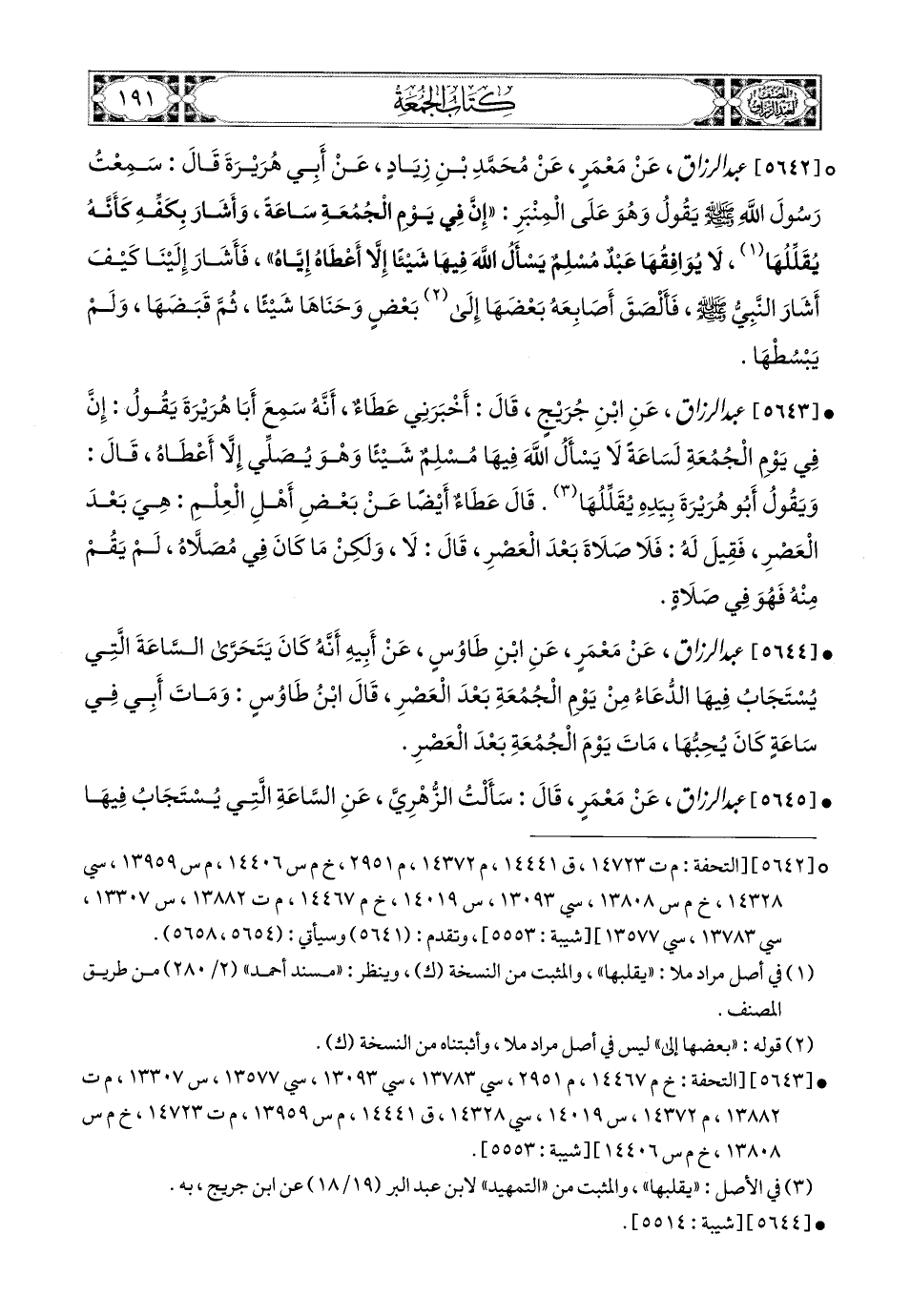 5642- عبد الرزاق، عَنْ مَعْمَرٍ، عَن مُحَمَّدِ بْنِ زِيَادٍ، عَنْ أَبِي هُرَيرَةَ، قَالَ: سَمِعْتُ رَسُولَ اللهِ صَلَّى اللهُ عَلَيْهِ وَسَلَّمَ يَقُولُ وَهُوَ عَلَى المِنْبَرِ: إِنَّ فِي يَوْمِ الْجُمُعَةِ سَاعَةٌ، وَأَشَارَ بِكَفِّهِ كَأَنَّهُ يُقَلِّلُهَا، لاَ يُوَافِقُهَا عَبدٌ مُسْلِمٌ يَسْأَلُ اللهَ فِيهَا شَيْئًا، إِلاَّ أَعْطَاهُ إِيَّاهُ، فَأَشَارَ إِلَيْنَا كَيْفَ أَشَارَ النَّبِيُّ صَلَّى اللهُ عَلَيْهِ وَسَلَّمَ، فَأَلْصَقَ أَصَابِعَهُ بَعْضَهَا إِلَى بَعْضٍ، وَحَنَاهَا شَيْئًا، ثُمَّ قَبَضَهَا وَلَمْ يَبْسُطْهَا.