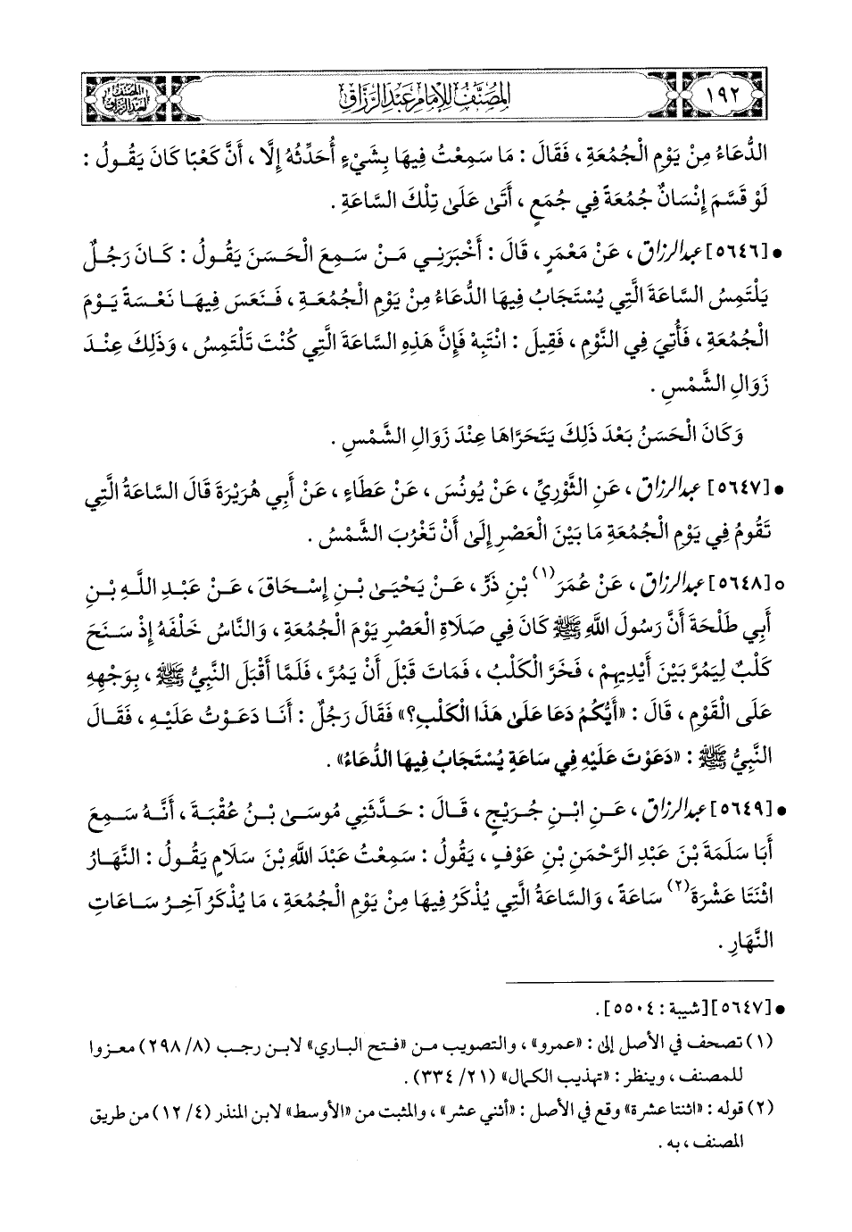5649- عبد الرزاق، عَنِ ابْنِ جُرَيْجٍ، قَالَ: حَدَّثَنِي مُوسَى بن عُقْبَةَ، أَنَّهُ سَمِعَ أَبَا سَلَمَةَ بن عَبدِ الرَّحْمَنِ بْنِ عَوْفٍ يَقُولُ: سَمِعْتُ عَبدَ اللهِ بن سَلاَمٍ يَقُولُ: النَّهَارُ اثْنَتَا عَشْرَةَ سَاعَةً، وَالسَّاعَةُ الَّتِي يُذْكَرُ فِيهَا مِنْ يَوْمِ الْجُمُعَةِ مَا يُذْكَرُ، آخِرُ سَاعَاتِ النَّهَارِ.