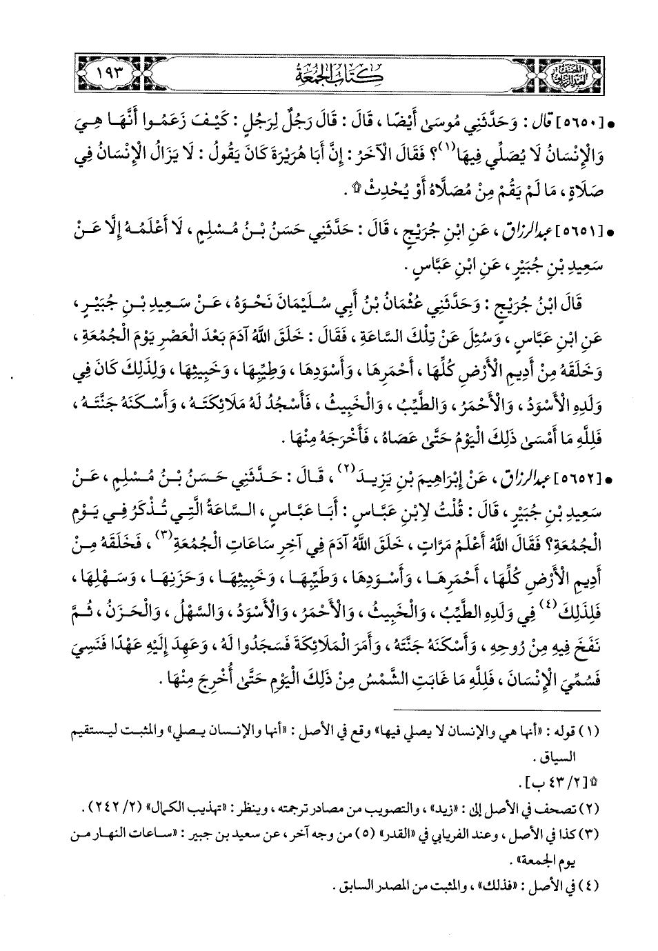 5652- عبد الرزاق، عَن إِبرَاهِيمَ بنِ يَزِيدَ، قَالَ: حَدَّثَنِي حَسَنُ بن مُسْلِمٍ، عَن سَعيدِ بنِ جُبَيرٍ قَالَ: قُلْتُ لاِبْنِ عَبَّاسٍ: ياأَبَا عَبَّاسٍ، السَّاعَةُ الَّتِي تُذْكَرُ فِي يَوْمِ الْجُمُعَةِ؟ فَقَالَ: اللهُ أَعْلَمُ مَرَّاتٍ، خَلَقَ اللهُ آدَمَ فِي آخِرِ سَاعَاتِ يوم الْجُمُعَةِ، فَخَلَقَهُ مِنْ أَدِيمِ الأَرْضِ كُلِّهَا أَحْمَرِهَا وَأَسْوَدِهَا وَطَيِّبِهَا وَخَبِيثِهَا وَحَزْنِهَا وَسَهْلِهَا، فَلِذَلِكَ فِي وَلَدِهِ الطَّيِّبُ وَالْخَبِيثُ وَالأَحْمَرُ وَالأَسْوَدُ وَالسَّهْلُ وَالْحَزْنُ، ثُمَّ نَفَخَ فِيهِ مِنْ رُوحِهِ، وَأَسْكَنَهُ جَنَّتَّهُ، وَأَمَرَ المَلاَئِكَةَ فَسَجَدُوا لَهُ، وَعَهِدَ إِلَيْهِ عَهْدًا فَنَسِيَ فَسُمِّيَ الإِنْسَانَ، فَللهِ مَا غَابَتِ الشَّمْسُ مِنْ ذَلِكَ الْيَوْمِ حَتَّى أَخْرَجَهُ مِنْهَا.