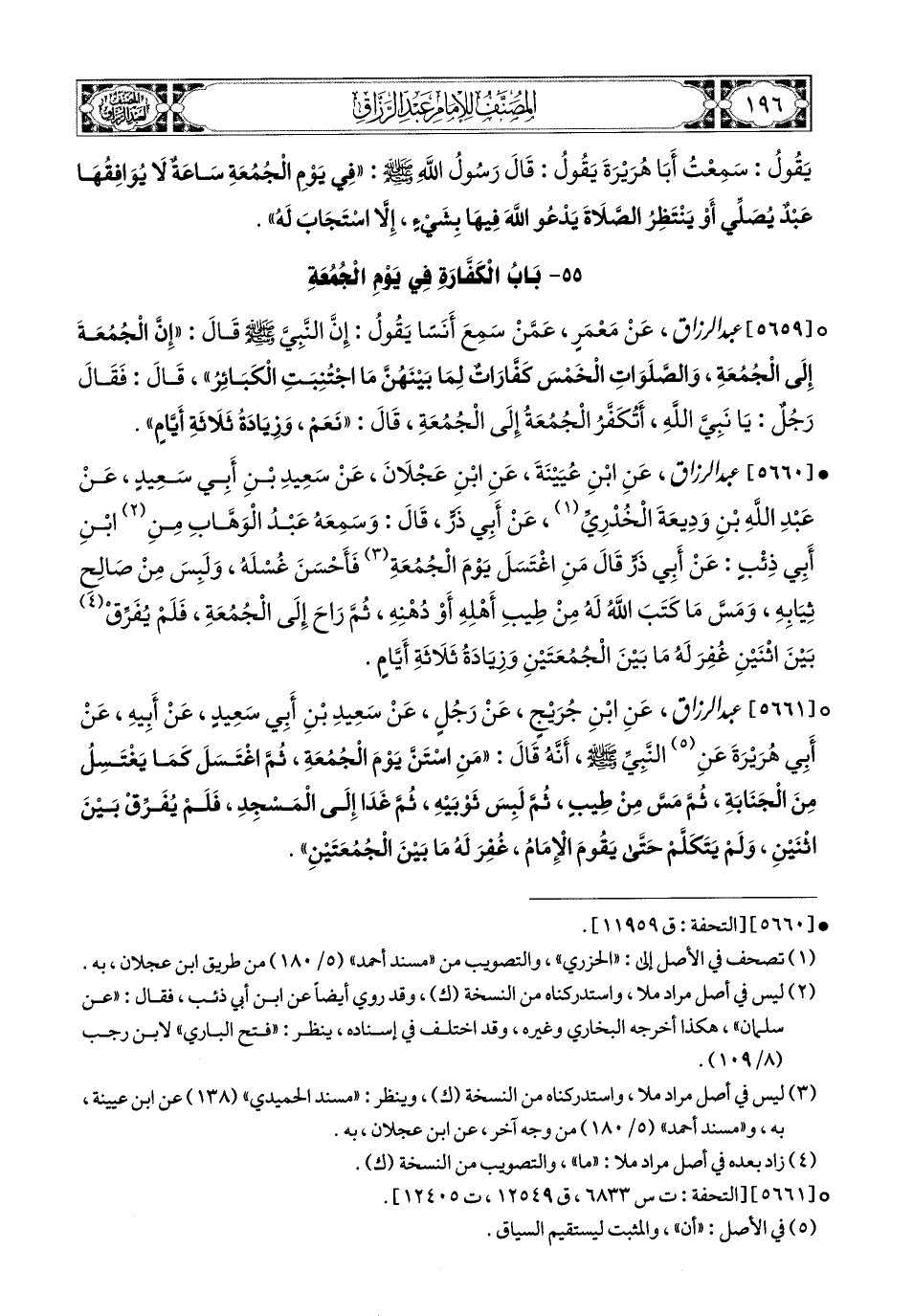 5661- عبد الرزاق، عَنِ ابْنِ جُرَيْجٍ، عَن رَجُلٍ، عَن سَعيدِ بْنِ أَبِي سَعيدٍ، عَنْ أَبِيهِ، عَنْ أَبِي هُرَيرَةَ، عَنِ النَّبِيِّ صَلَّى اللهُ عَلَيْهِ وَسَلَّمَ، أَنَّهُ قَالَ: مَنِ اسْتَنَّ يَوْمَ الْجُمُعَةِ، ثُمَّ اغْتَسَلَ كَمَا يَغْتَسِلُ مِنَ الْجَنَابَةِ، ثُمَّ مَسَّ مِنْ طِيبٍ، ثُمَّ لَبِسَ ثَوْبَيْهِ، ثُمَّ غَدَا إِلَى المَسْجِدِ، فَلَمْ يُفَرِّقْ بَيْنَ اثْنَيْنِ، وَلَمْ يَتَكَلَّمْ، حَتَّى يَقُومَ الإِمَامُ، غُفِرَ لَهُ مَا بَيْنَ الْجُمُعَتَيْنِ.