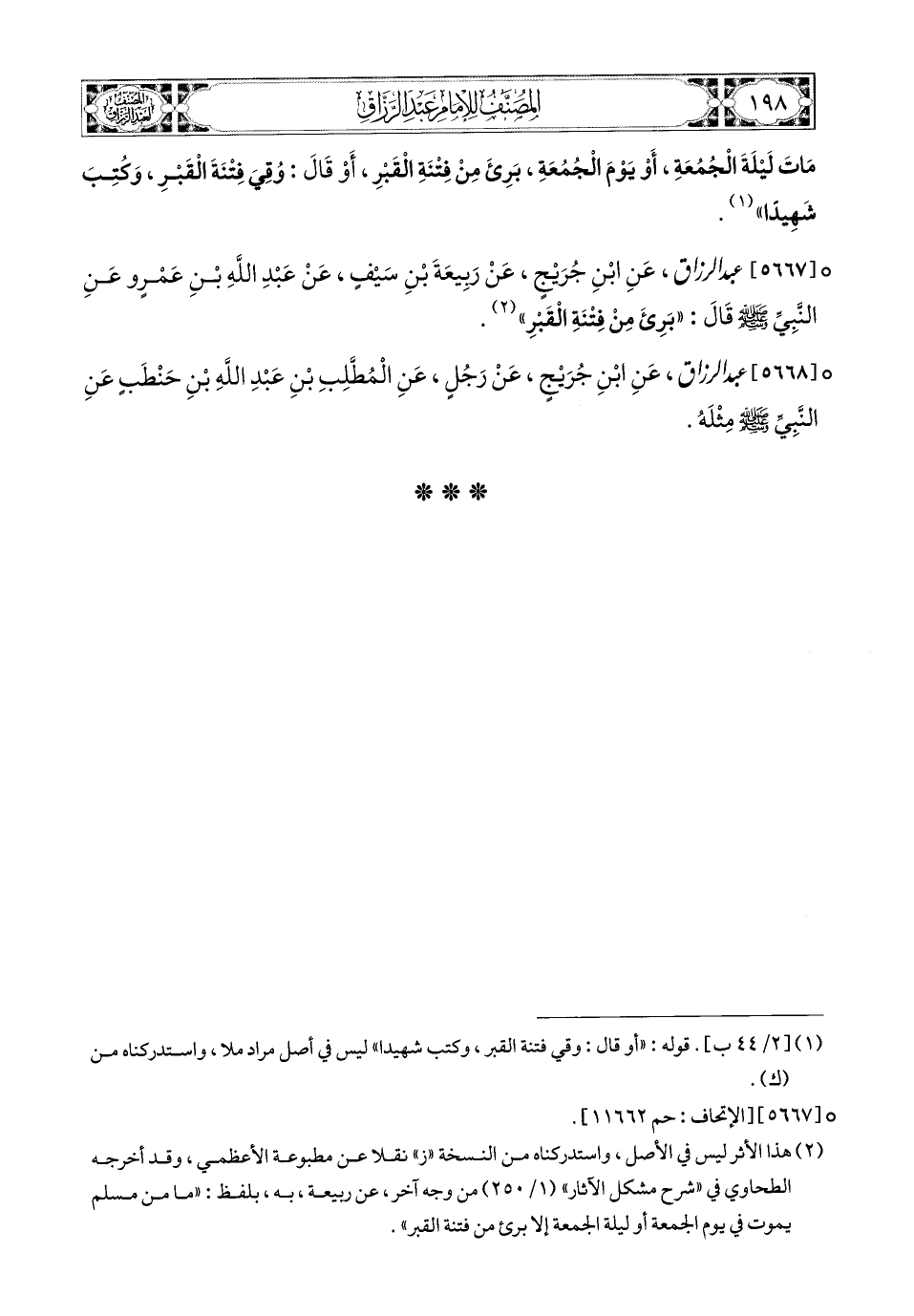 5667- عبد الرزاق، عَنِ ابْنِ جُرَيْجٍ، عَن رَبِيعَةَ بْنِ سَيْفٍ، عَنْ عَبدِ اللهِ بْنِ عَمْرٍو، عَنِ النَّبِيِّ صَلَّى اللهُ عَلَيْهِ وَسَلَّمَ قَالَ: بَرِئَ مِنْ فِتْنَةِ الْقَبْرِ.