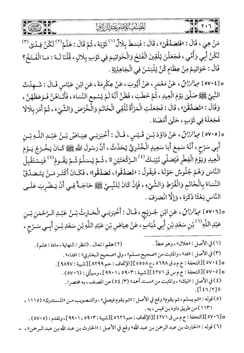 5705- عبد الرزاق، عَن دَاوُدَ بْنِ قَيْسٍ، قَالَ: أَخْبَرَنِي عِيَاضُ بن عَبدِ اللهِ بْنِ أَبِي سَرْحٍ، أَنَّهُ سَمِعَ أَبَا سَعيدٍ الْخُدْرِيُّ يُحَدِّثُ، أَنَّ رَسُولَ اللهِ صَلَّى اللهُ عَلَيْهِ وَسَلَّمَ كَانَ يَخْرُجُ يَوْمَ الْعِيدِ وَيَوْمَ الْفِطْرِ، فَيُصَلِّي تَيْنِكَ الرَّكْعَتَيْنِ، ثُمَّ يُسَلِّمُ، ثُمَّ يَقُومُ فَيَسْتَقْبِلُ النَّاسَ وَهُمْ جُلُوسٌ حَوْلَهُ، فَيَقُولُ: تَصَدَّقُوا، تَصَدَّقُوا، فَكَانَ أَكْثَرُ مَنْ يَتَصَدَّقُ النِّسَاءُ بِالْخَاتَمِ وَالْقُرْطِ وَالشَّيءِ، فَإِنْ كَانَ لِلنَّبِيِّ صَلَّى اللهُ عَلَيْهِ وَسَلَّمَ حَاجَةٌ فِي أَنْ يَضْرِبَ عَلَى النَّاسِ بَعْثَا ذَكَرَهُ وَإِلاَّ انْصَرَفَ.