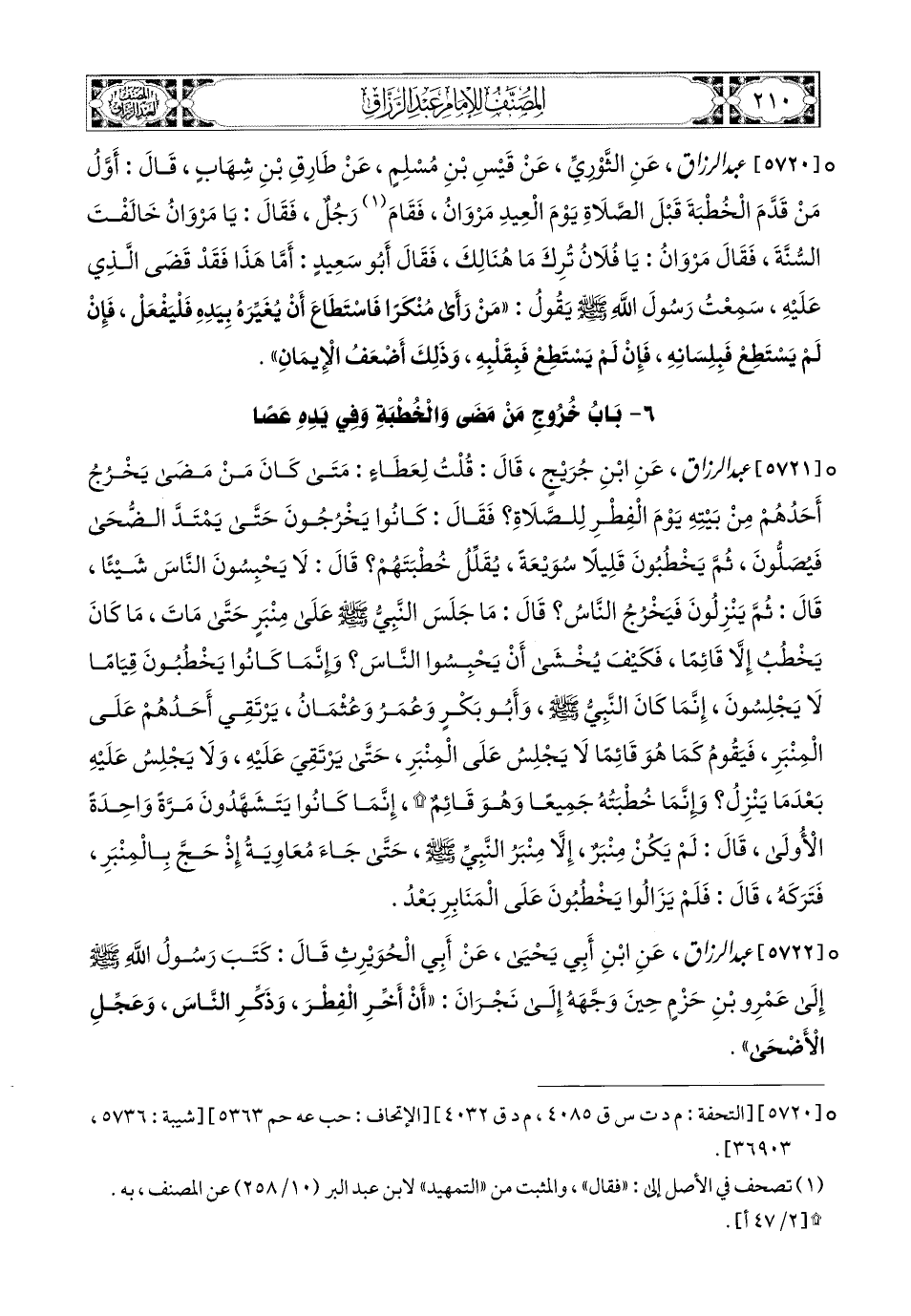 5720- عبد الرزاق، عَنِ الثَّورِيِّ، عَن قَيْسِ بْنِ مُسْلِمٍ، عَن طَارِقِ بْنِ شِهَابٍ قَالَ: أَوَّلُ مَنْ قَدَّمَ الْخُطْبَةَ قَبْلَ الصَّلاَةِ يَوْمَ الْعِيدِ: مَرْوَانُ، فَقَامَ رَجُلٌ، فَقَالَ: يَا مَرْوَانُ، خَالَفْتَ السُّنَّةَ، فَقَالَ مَرْوَانُ: يَا فُلاَنُ، تُرِكَ مَا هُنَالِكَ، فَقَالَ أَبو سَعيدٍ: أَمَّا هَذَا فَقَدْ قَضَى الَّذِي عَلَيْهِ، سَمِعْتُ رَسُولَ اللهِ صَلَّى اللهُ عَلَيْهِ وَسَلَّمَ يَقُولُ: مَنْ رَأَى مِنْكُمْ مُنْكَرًا فَاسْتَطَاعَ أَنْ يُغَيِّرَهُ بِيَدِهِ فَلْيَفْعَلْ، فَإِنْ لَمْ يَسْتَطِعْ فَبِلِسَانِهِ، فَإِنْ لَمْ يَسْتَطِعْ فَبِقَلْبِهِ، وَذَلِكَ أَضْعَفُ الإِيمَانِ.