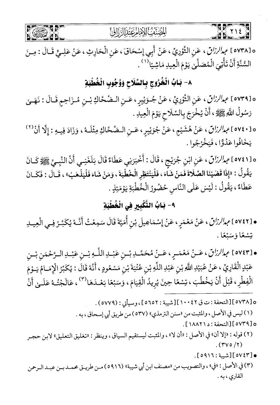 5743- عبد الرزاق، عَنْ مَعْمَرٍ، عَن مُحَمَّدِ بْنِ عَبدِ اللهِ بْنِ عَبدِ الرَّحْمَنِ بْنِ عَبدٍ الْقَارِيِّ، عَن عُبَيْدِ اللهِ بْنِ عَبدِ اللهِ بْنِ عُتْبَةَ بْنِ مَسْعُودٍ، أَنَّهُ قَالَ: يُكَبِّرُ الإِمَامُ يَوْمَ الْفِطْرِ قَبْلَ أَنْ يَخْطُبَ تِسْعًا حِينَ يُرِيدُ الْقِيَامَ وَسَبْعًا بَعْدَهَا، عَالَجْتُهُ عَلَى أَنْ يُفَسِّرَ لِي أَحْسَنَ مِنْ هَذَا، فَلَمْ يَسْتَطِعْ، فَظَنَنْتُ أَنَّه قَوْلَهُ حِينَ يُرِيدُ الْقِيَامَ فِي الْخُطْبَةِ الآخِرَةِ.