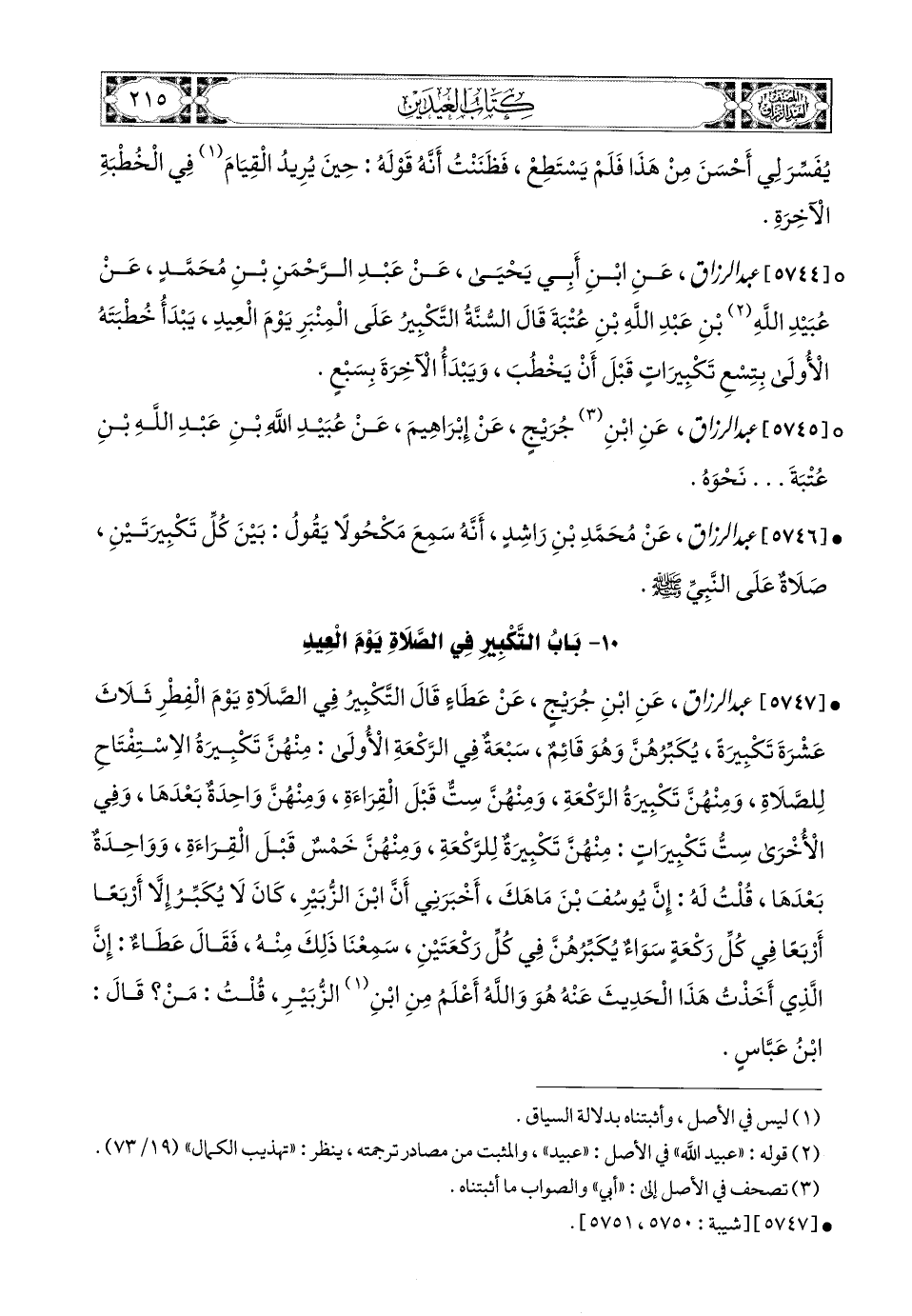 5744- عبد الرزاق، عَنِ ابْنِ أَبِي يَحيَى، عَنْ عَبدِ الرَّحْمَنِ بْنِ مُحَمَّدٍ، عَن عُبَيْدِ اللهِ بْنِ عَبدِ اللهِ بْنِ عُتْبَةَ قَالَ: السُّنَّةُ التَّكْبِيرُ عَلَى المِنْبَرِ يَوْمَ الْعِيدِ، يَبْدَأُ خُطْبَتَهُ الأُولَى بِتِسْعِ تَكْبِيرَاتٍ قَبْلَ أَنْ يَخْطُبَ، وَيَبْدَأُ الآخِرَةَ بِسَبْعٍ.