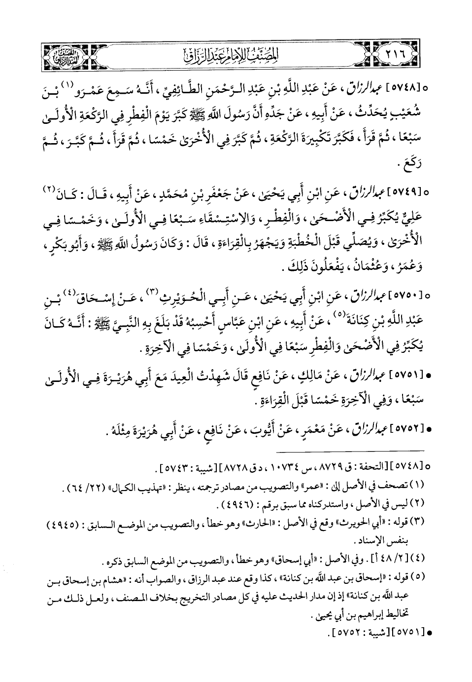5748- عبد الرزاق، عَنْ عَبدِ اللهِ بْنِ عَبدِ الرَّحْمَنِ الطَّائفِيِّ، أَنَّهُ سَمِعَ عَمْرَو بن شُعَيْبٍ يُحَدِّثُ عَنْ أَبِيهِ، عَن جَدِّهِ، أَنَّ رَسُولَ اللهِ صَلَّى اللهُ عَلَيْهِ وَسَلَّمَ كَبَّرَ يَوْمَ الْفِطْرِ فِي الرَّكْعَةِ الأُولَى سَبْعًا، ثُمَّ قَرَأَ فَكَبَّرَ تَكْبِيرَةَ الرَّكْعَةِ، ثُمَّ كَبَّرَ فِي الأُخْرَى خَمْسًا، ثُمَّ قَرَأَ، ثُمَّ كَبَّرَ، ثُمَّ رَكَعَ.