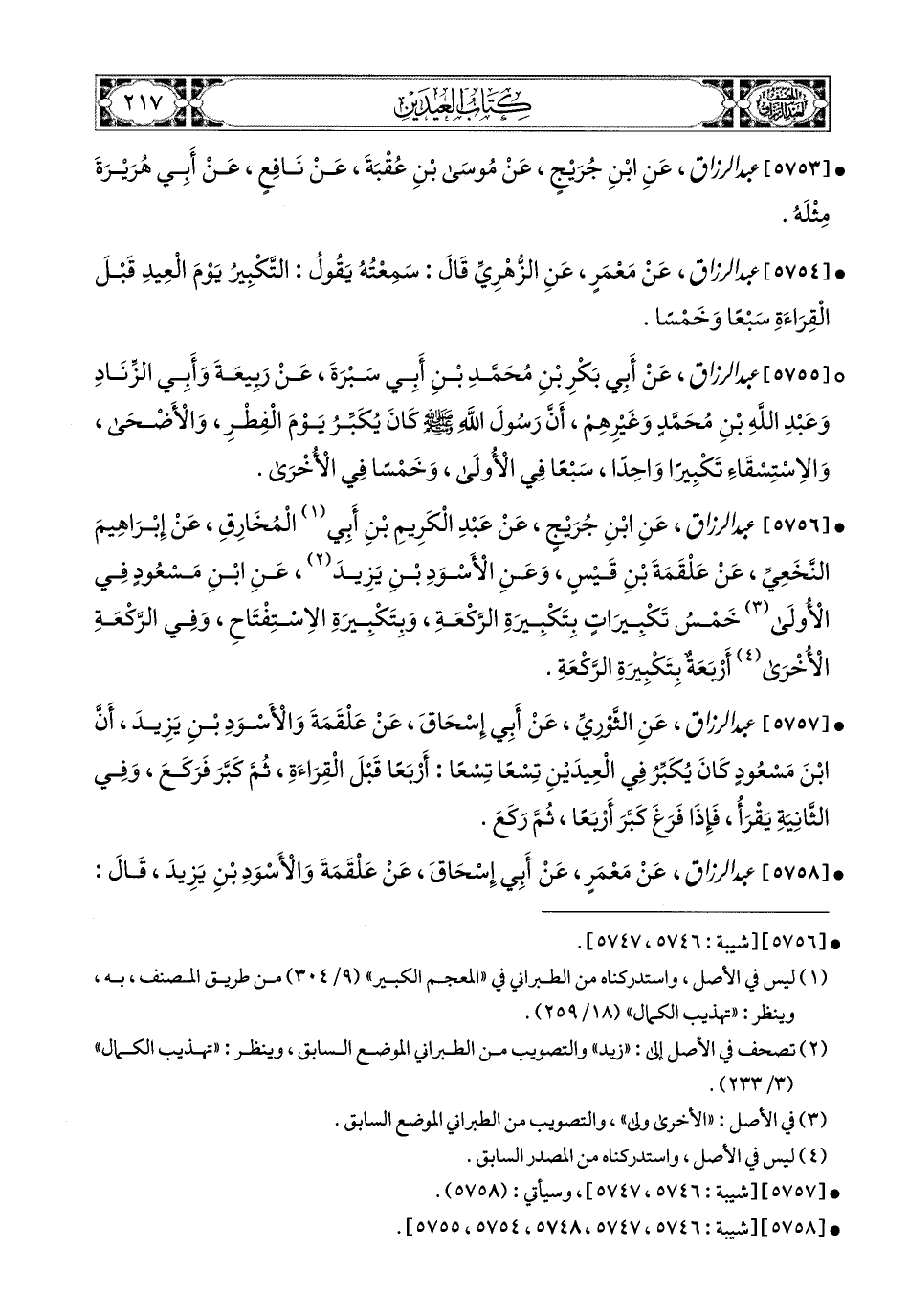 5758- عبد الرزاق، عَنْ مَعْمَرٍ، عَنْ أَبِي إِسْحَاقَ، عَنْ عَلْقَمَةَ، وَالأَسْوَدِ بْنِ يَزِيدَ قَالَ: كَانَ ابْنُ مَسْعُودٍ جَالِسًا وَعِنْدَهُ حُذَيْفَةُ، وَأَبو مُوسَى الأَشْعَرِيُّ، فَسَأَلَهُمَا سَعيدُ بن الْعَاصِ عَنِ التَّكْبِيرِ فِي الصَّلاَةِ يَوْمَ الْفِطْرِ وَالأَضْحَى، فَجَعَلَ هَذَا يَقُولُ: سَلْ هَذَا، وَهَذَا يَقُولُ: سَلْ هَذَا، فَقَالَ لَهُ حُذَيْفَةُ: سَلْ هَذَا، لِعَبْدِ اللهِ بْنِ مَسْعُودٍ، فَسَأَلَهُ، فَقَالَ ابْنُ مَسْعُودٍ: يُكَبِّرُ أَرْبَعًا، ثُمَّ يَقْرَأُ، ثُمَّ يُكَبِّرُ فَيَرْكَعُ، ثُمَّ يَقُومُ فِي الثَّانِيَةِ فَيَقْرَأُ، ثُمَّ يُكَبِّرُ أَرْبَعًا بَعْدَ الْقِرَاءَةِ.