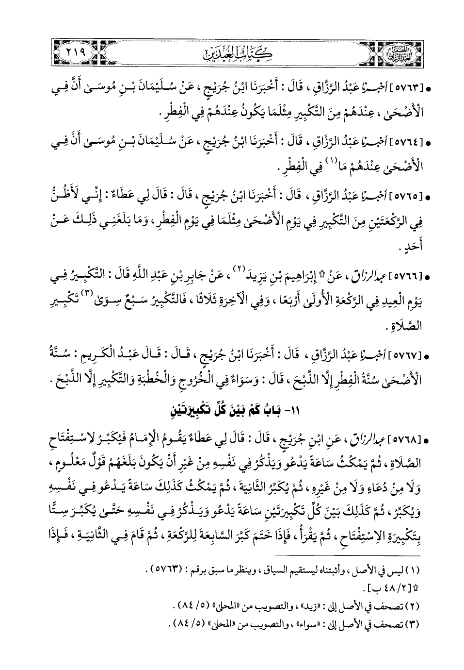 5763- أخبرنا عبد الرزاق، قَالَ: أَخْبَرَنَا ابْنُ جُرَيْجٍ، عَن سُلَيْمَانَ بْنِ مُوسَى أَنَّ فِي الأَضْحَى، عِنْدَهُمْ مِنَ التَّكْبِيرِ مِثْلَمَا يَكُونُ عِنْدَهُمْ فِي الْفِطْرِ.