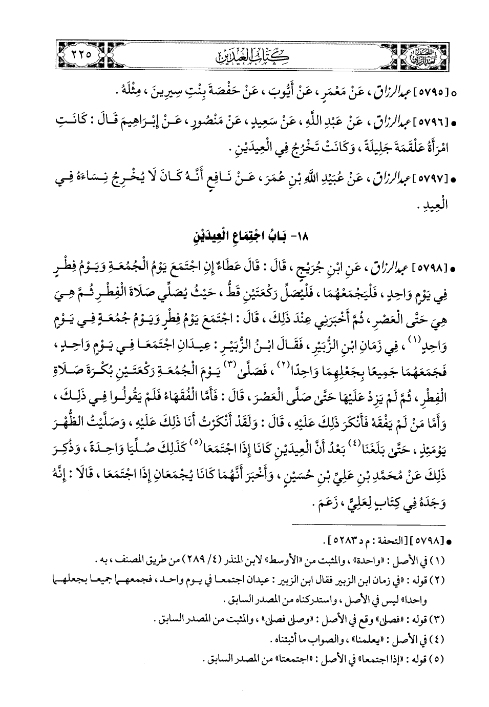 5797- عبد الرزاق، عَن عُبَيْدِ اللهِ بْنِ عُمَرَ، عَن نَافِعٍ، أَنَّهُ كَانَ لاَ يُخْرِجُ نِسَاءَهُ فِي الْعِيدِ.