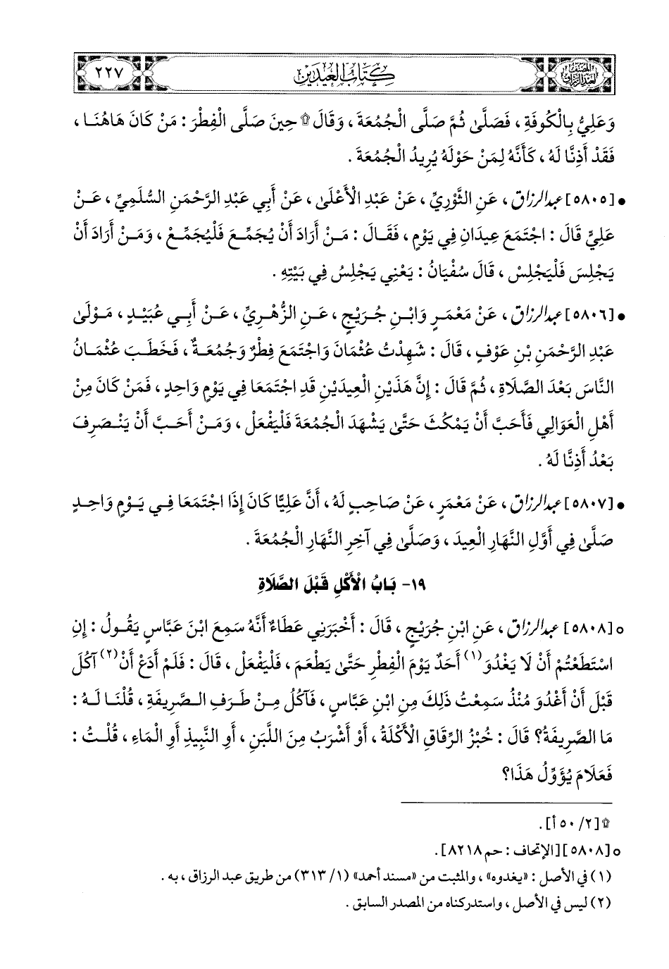 5808 - عبد الرزاق، عَنِ ابْنِ جُرَيْجٍ، قَالَ: أَخْبَرَنِي عَطَاءٌ، أَنَّهُ سَمِعَ ابْنَ عَبَّاسٍ يَقُولُ: إِنِ اسْتَطَعْتُمْ أَنْ لاَ يَغْدُوَ أَحَدٌ يَوْمَ الْفِطْرِ حَتَّى يَطْعَمَ فَلْيَفْعَلْ، قَالَ: فَلَمْ أَدَعْ أَنْ آكُلَ قَبْلَ أَنْ أَغْدُوَ مُنْذُ سَمِعْتُ ذَلِكَ مِنَ ابْنِ عَبَّاسٍ، فَآكُلُ مِنْ طَرَفِ الصَّرِيفةِ (1)، قُلْنَا لَهُ: مَا الصَّرِيفَةُ؟ قَالَ: خُبْزُ الرِّقَاقِ الأَكْلَةُ، أَوْ أَشْرَبُ مِنَ اللَّبَنِ، أَوِ النَّبِيذِ، أَوِ المَاءِ، قُلْتُ: فَعَلاَمَ يُؤَوِّلُ (2) هَذَا؟.
