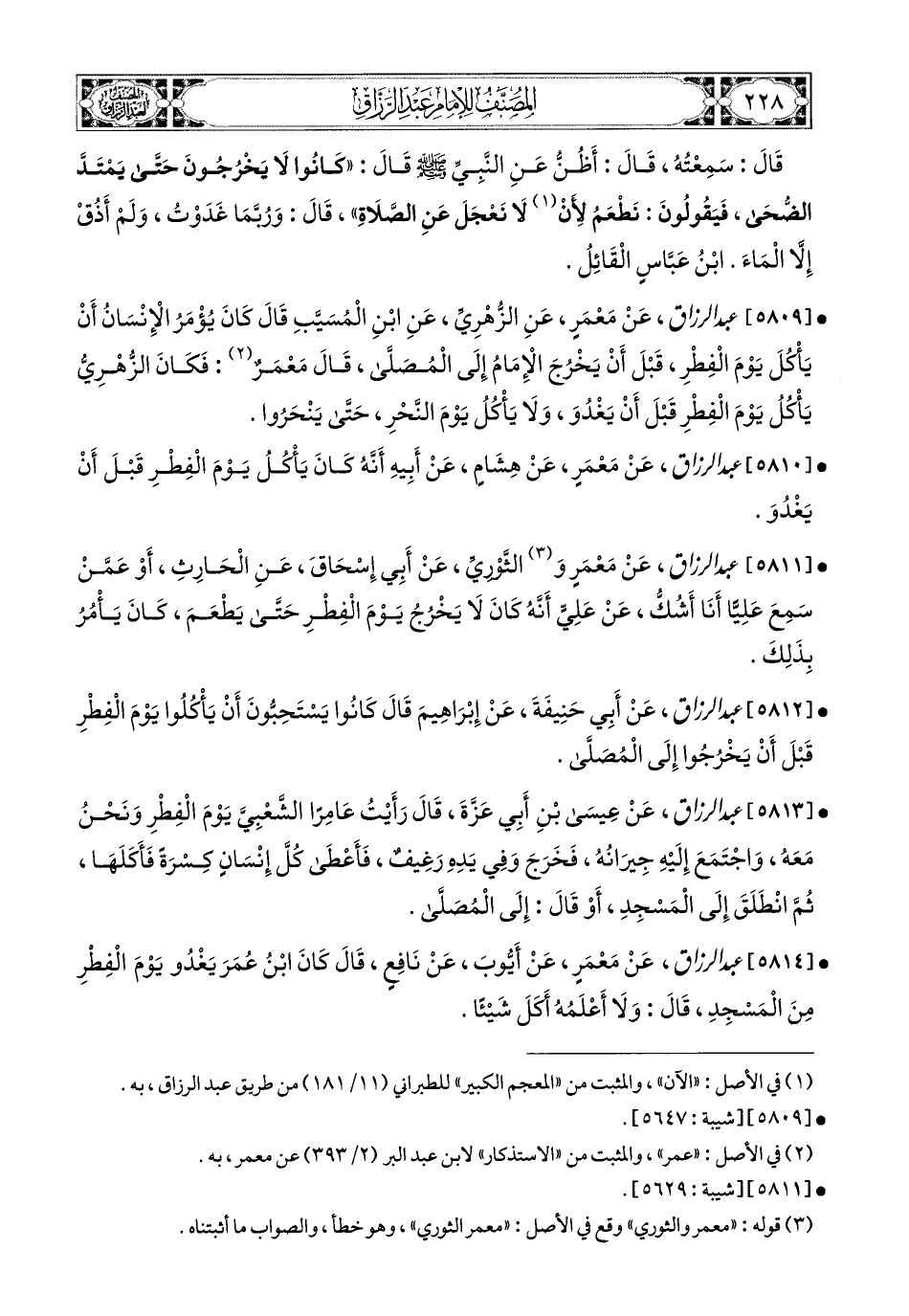 5810- عبد الرزاق، عَنْ مَعْمَرٍ، عَن هِشَامٍ، عَنْ أَبِيهِ، أَنَّهُ كَانَ يَأْكُلُ يَوْمَ الْفِطْرِ قَبْلَ أَنْ يَغْدُوَ.