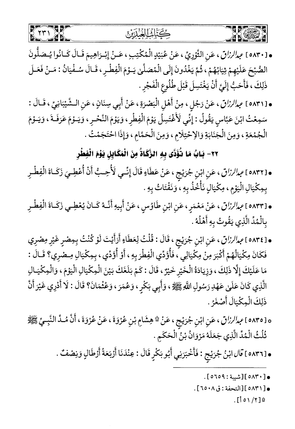 5834- عبد الرزاق، عَنِ ابْنِ جُرَيْجٍ، قَالَ: قُلْتُ لِعَطَاءٍ: أَرَأَيْتَ لَوْ كُنْتُ بِمِصْرٍ غَيْرِ مِصْرِي، فَكَانَ مِكْيَالُهُمْ أَكْبَرَ مِنْ مِكْيَالِي، فَأُؤَدِّي الْفِطْرَ بِهِ، أَوْ أُؤَدِّي بِمِكْيَالِ مِصْرِي؟ قَالَ: مَا عَلَيْكَ إِلاَّ ذَلِكَ، وَزِيَادَةُ الْخَيْرِ خَيْرٌ، قَالَ: كَمْ بَلَغَكَ بَيْنَ المِكْيَالِ الْيَوْمَ وَالمِكْيَالِ الَّذِي كَانَ عَلَى عَهْدِ رَسُولِ اللهِ صَلَّى اللهُ عَلَيْهِ وَسَلَّمَ، وَأَبِي بَكْرٍ، وَعُمَرَ، وَعُثْمَانَ؟ قَالَ: لاَ أَدْرِي، غَيْرَ أَنَّ ذَلِكَ المِكْيَالَ أَصْغَرُ.