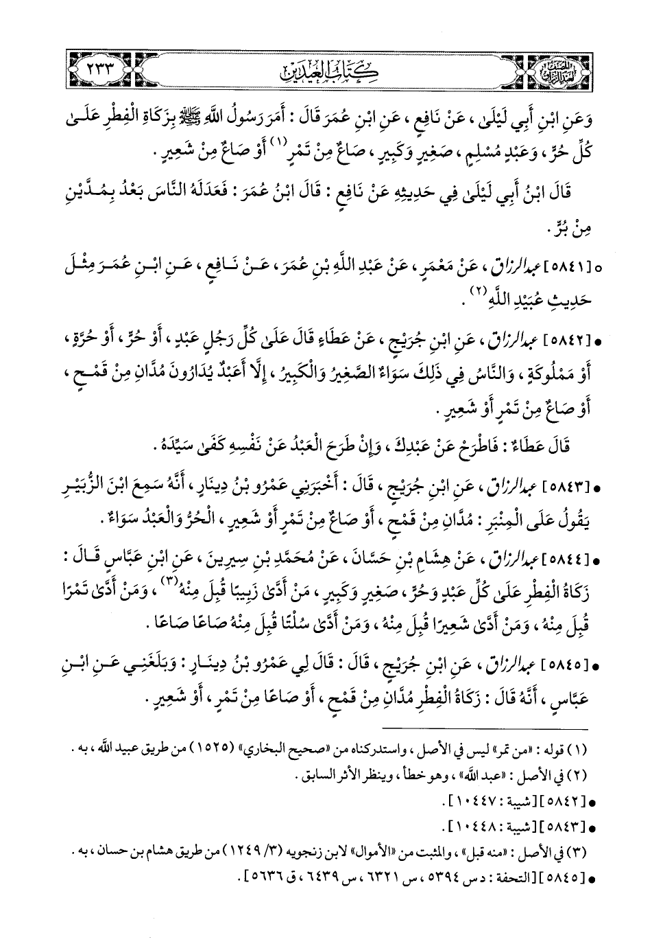 5844 - عبد الرزاق، عَن هِشَامِ بْنِ حَسَّانَ، عَن مُحَمَّدِ بْنِ سِيرِينَ، عَنِ ابْنِ عَبَّاسٍ، قَالَ: زَكَاةُ الْفِطْرِ عَلَى كُلِّ عَبدٍ وَحُرٍّ (1)، صَغِيرٍ وَكَبِيرٍ، مَنْ أَدَّى زَبِيبًا قُبِلَ مِنْهُ، وَمَنْ أَدَّى تَمْرًا قُبِلَ مِنْهُ، وَمَنْ أَدَّى شَعِيرًا قَبِلَ مِنْهُ، وَمَنْ أَدَّى سُلْتًا قُبِلَ مِنْهُ صَاعًا صَاعًا.