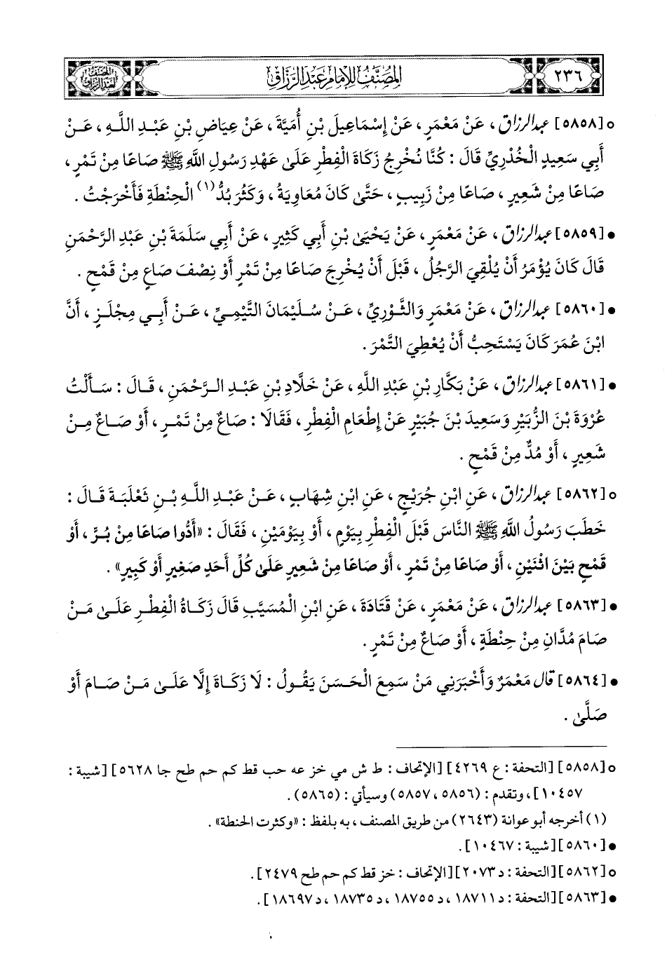 5860- عبد الرزاق، عَنْ مَعْمَرٍ، وَالثَّورِيِّ، عَن سُلَيْمَانَ التَّيْمِيِّ، عَنْ أَبِي مِجْلَزٍ، أَنَّ ابْنَ عُمَرَ كَانَ يَسْتَحِبُّ أَنْ يُعْطِي التَّمْرَ.