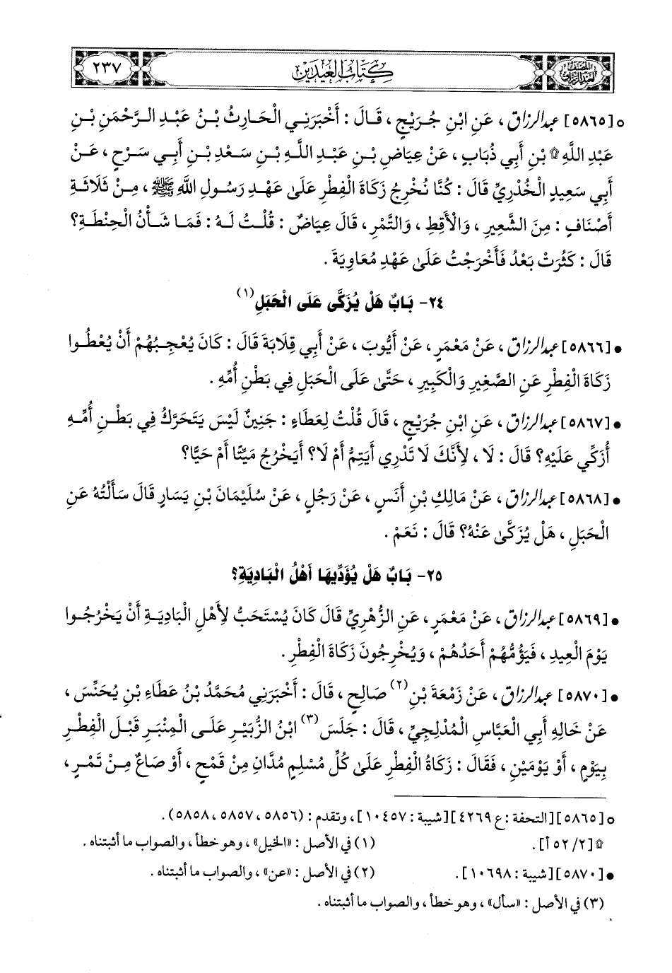 5866- عبد الرزاق، عَنْ مَعْمَرٍ، عَنْ أَيُّوبَ، عَنْ أَبِي قِلاَبَةَ قَالَ: كَانَ يُعْجِبُهُمْ أَنْ يُعْطُوا زَكَاةَ الْفِطْرِ عَنِ الصَّغِيرِ وَالْكَبِيرِ حَتَّى عَلَى الْحَبَلِ فِي بَطْنِ أُمِّهِ.
