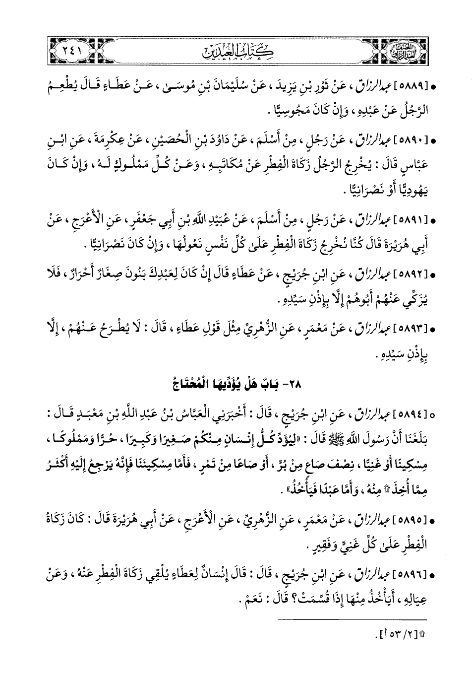 5891- عبد الرزاق، عَن رَجُلٍ مِنْ أَسْلَمَ، عَن عُبَيْدِ اللهِ بْنِ أَبِي جَعْفَرٍ، عَنِ الأَعْرَجِ، عَنْ أَبِي هُرَيرَةَ، قَالَ: كُنَّا نُخْرِجُ زَكَاةَ الْفِطْرِ عَلَى كُلِّ نَفْسٍ نَعُولُهَا، وَإِنْ كَانَ نَصْرَانِيًّا.