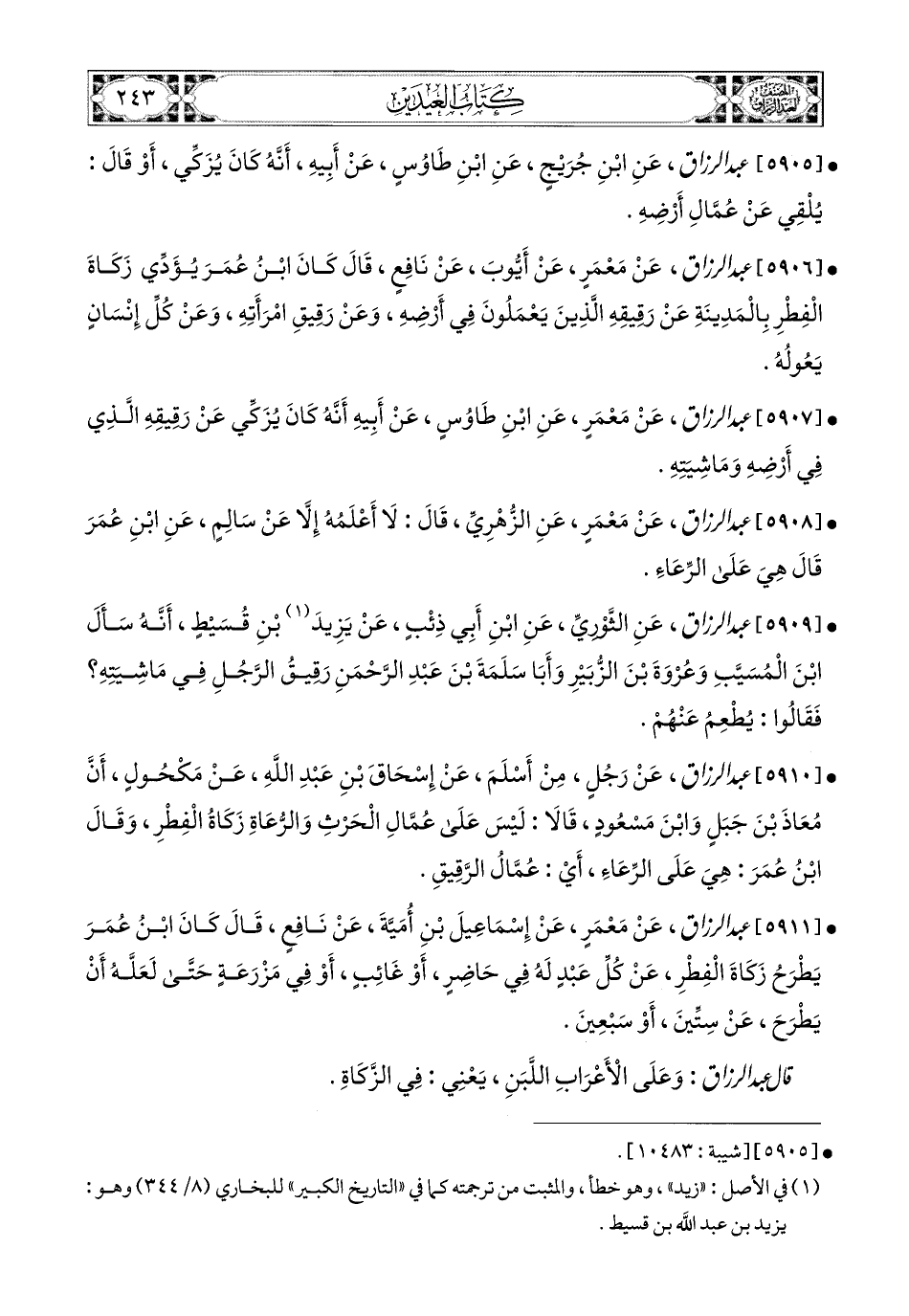 5910- عبد الرزاق، عَن رَجُلٍ مِنْ أَسْلَمَ، عَن إِسْحَاقَ بْنِ عَبدِ اللهِ، عَنْ مَكْحُولٍ، أَنَّ مُعَاذَ بن جَبَلٍ، وَابْنَ مَسْعُودٍ، قَالاَ: لَيْسَ عَلَى عُمَّالِ الْحَرْثِ وَالرُّعَاةِ زَكَاةُ الْفِطْرِ، وَقَالَ ابْنُ عُمَرَ: هِيَ عَلَى الرِّعَاءِ أي عُمَّالِ الرَّقِيقِ.