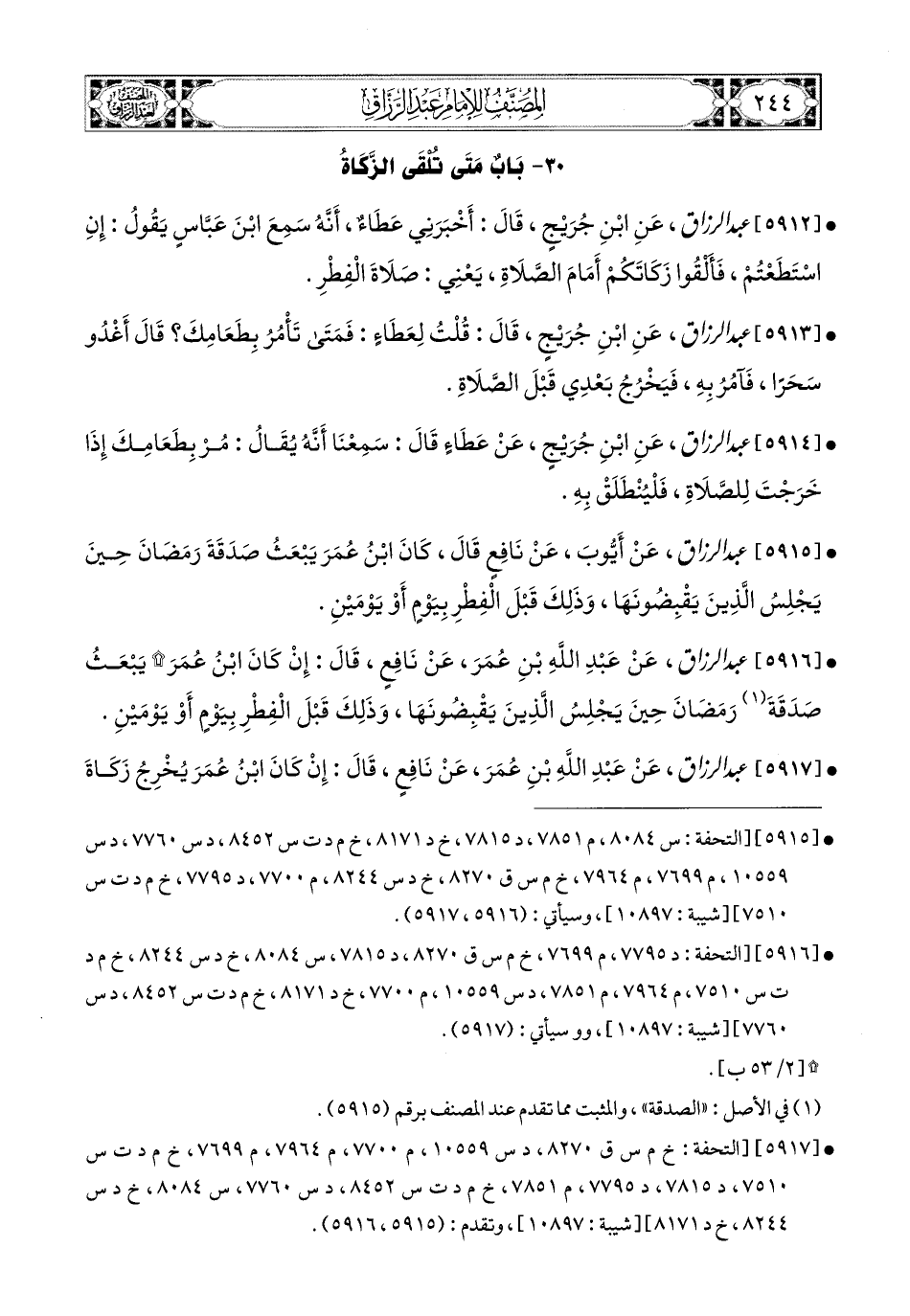5912- عبد الرزاق، عَنِ ابْنِ جُرَيْجٍ، قَالَ: أَخْبَرَنِي عَطَاءٌ، أَنَّهُ سَمِعَ ابْنَ عَبَّاسٍ يَقُولُ: إِنِ اسْتَطَعْتُمْ فَأَلْقُوا زَكَاتَكُمْ أَمَامَ الصَّلاَةِ، يَعْنِي صَلاَةَ الْفِطْرِ.