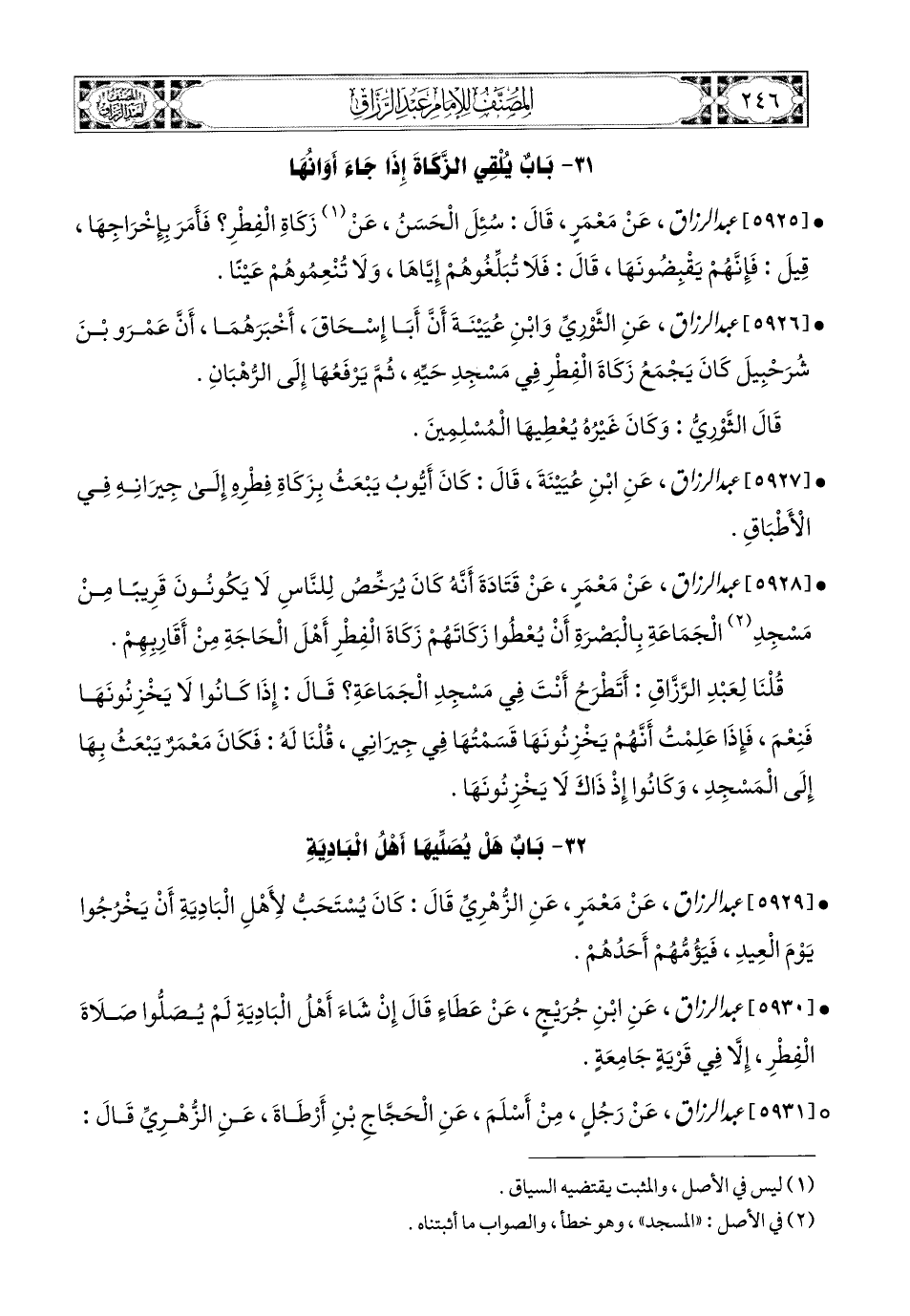 5926- عبد الرزاق، عَنِ الثَّورِيِّ، وَابْنِ عُيَيْنَةَ؛ أَنَّ أَبَا إِسْحَاقَ أَخْبَرَهُمَا، أَنَّ عَمْرَو بن شُرَحْبِيلَ كَانَ يَجْمَعُ زَكَاةَ الْفِطْرِ فِي مَسْجِدِ حَيِّهِ، ثُمَّ يَرْفَعُهَا إِلَى الرُّهْبَانِ.