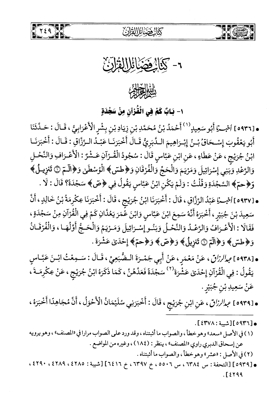 5936 - أَخْبَرَنَا أَبو سَعيدٍ أَحْمَدُ بن مُحَمَّدِ بْنِ زِيَادِ بْنِ بِشْرٍ الأَعْرَابِيُّ، قَالَ: حَدَّثنا أَبو يَعْقُوبَ إِسْحَاقُ بن إِبرَاهِيمَ الدَّبَرِيُّ، قَالَ: أَخْبَرَنَا عَبد الرزَّاق، قَالَ: أَخْبَرَنَا ابْنُ جُرَيْجٍ، عَنْ عَطَاءٍ، عَنِ ابْنِ عَبَّاسٍ، قَالَ: سُجُودُ الْقُرْآنِ عَشْرٌ: الأَعْرَافُ، وَالنَّحْلُ، وَالرَّعْدُ، وَبَنِي إِسْرَائِيلَ، وَمَرْيَمُ، وَالْحَجُّ، وَالْفُرْقَانُ، وَطس الْوُسْطَى، وَالم تَنْزِيلُ، وَحم السَّجْدَةَ، وََقُلْتُ: وَلَمْ يَكُنِ ابْنُ عَبَّاسٍ يَقُولُ فِي {ص} سَجْدَةٌ؟ قَالَ: لاَ.