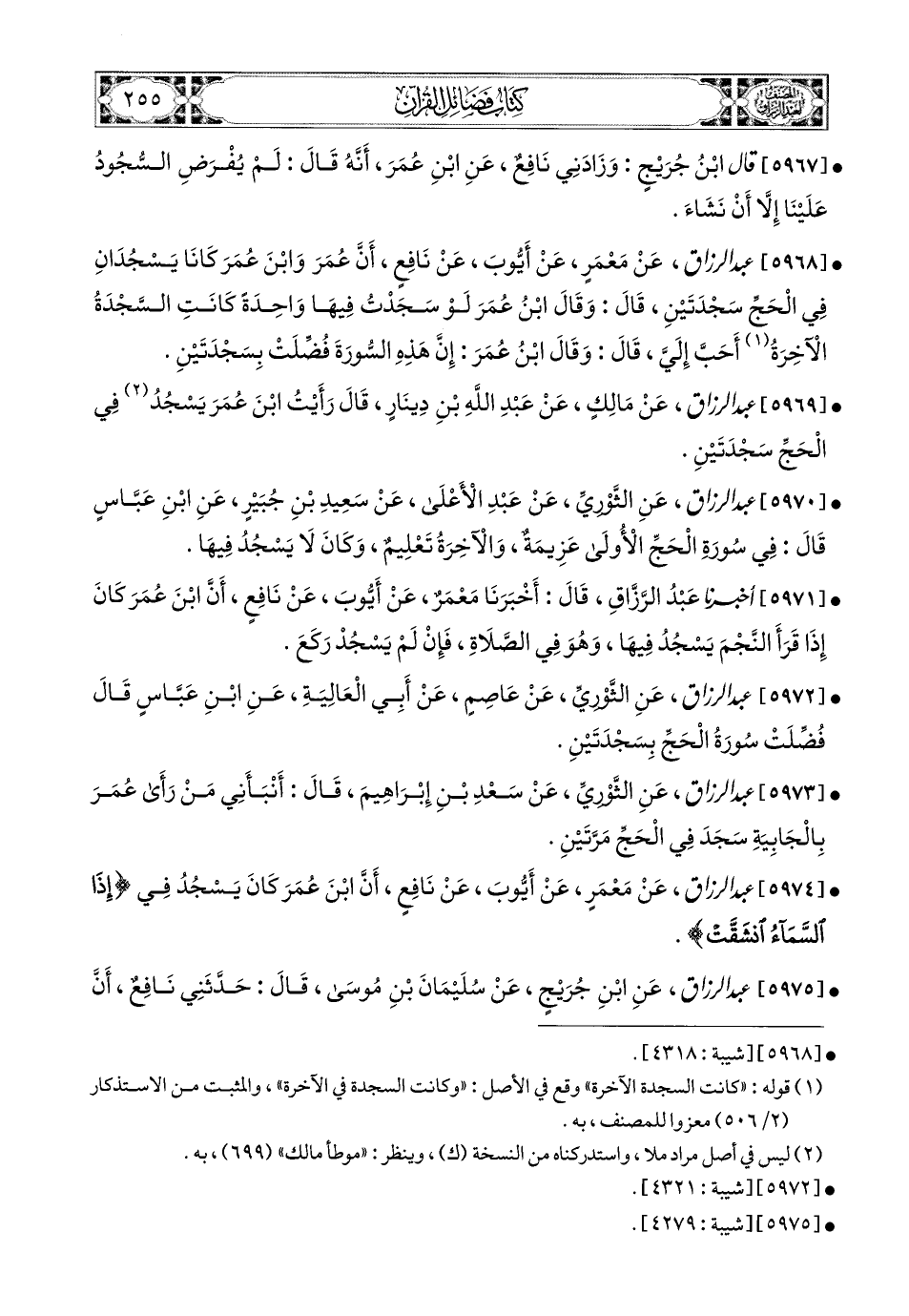 5968- عبد الرزاق، عَنْ مَعْمَرٍ، عَنْ أَيُّوبَ، عَن نَافِعٍ، أَنَّ عُمَرَ، وَابْنَ عُمَرَ كَانَا يَسْجُدَانِ فِي الْحَجِّ سَجْدَتَيْنِ، قَالَ: وَقَالَ ابْنُ عُمَرَ: لَوْ سَجَدْتُ فِيهَا وَاحِدَةً كَانَتِ السَّجْدَةُ الآخِرَةُ أَحَبَّ إِلَيَّ، قَالَ: وَقَالَ ابْنُ عُمَرَ: إِنَّ هَذِهِ السُّورَةَ فُضِّلَتْ بِسَجْدَتَيْنِ.