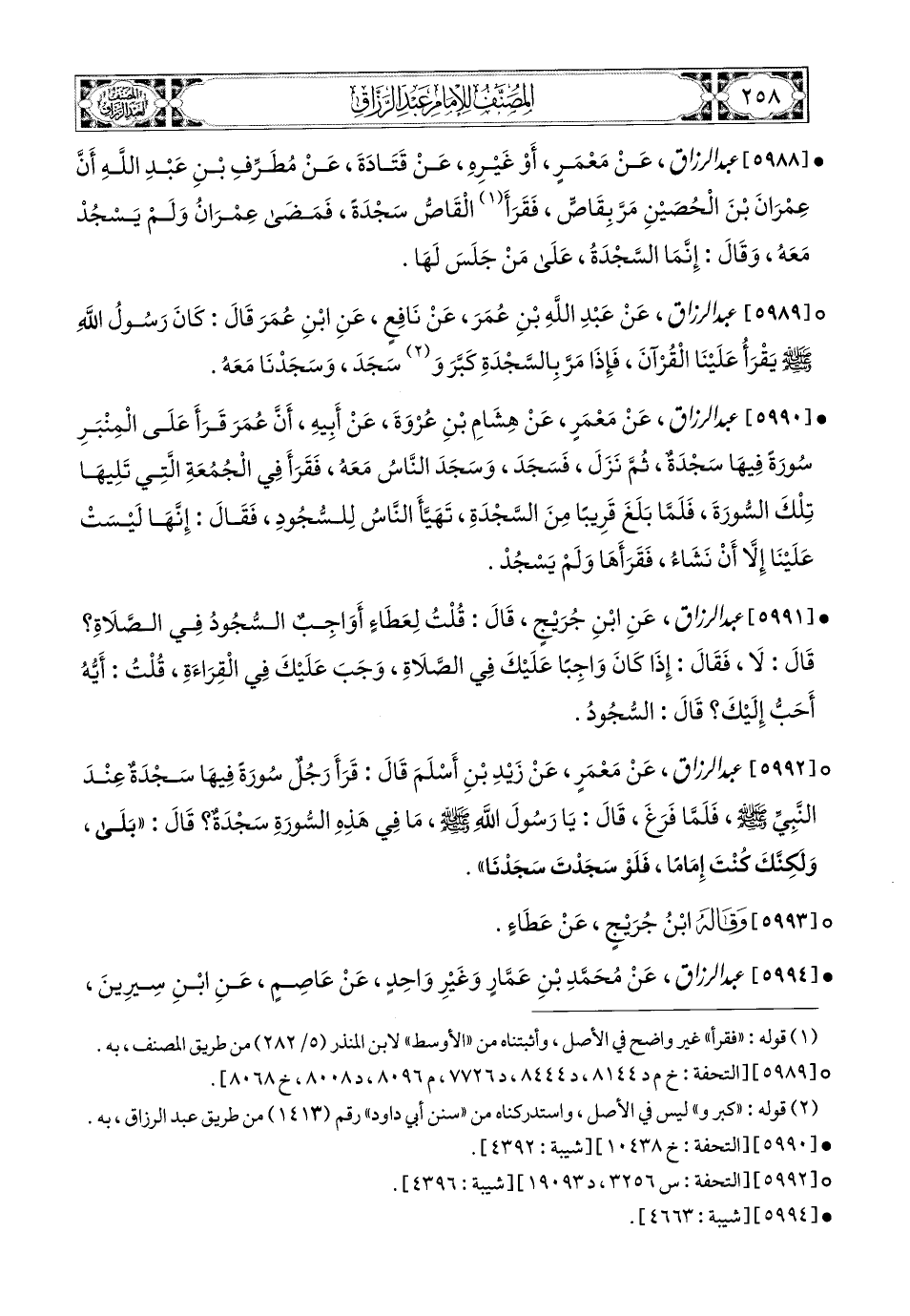 5989- عبد الرزاق، عَنْ عَبدِ اللهِ بْنِ عُمَرَ، عَن نَافِعٍ، عَنِ ابْنِ عُمَرَ، قَالَ: كَانَ رَسُولُ اللهِ صَلَّى اللهُ عَلَيْهِ وَسَلَّمَ يَقْرَأُ عَلَيْنَا الْقُرْآنَ، فَإِذَا مَرَّ بِالسَّجْدَةِ كَبَّرَ وَسَجَدَ وَسَجَدْنَا مَعَهُ.